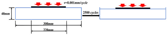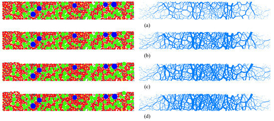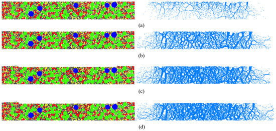 The virtual bearing plate (VBP) test was designed to investigate the evolution behavior of MFC characteristics in asphalt mixtures under external loading. The test was simulated using PFC2D 5.0. According to the Chinese specifications for the design of highway asphalt pavement [31], the standard axle load consists of a single axle with dual wheels. The loading imprint of each wheel can be represented using either a single-circle or double-circle model, with diameters of 302 mm and 213 mm, respectively. Accordingly, the length of all asphalt mixture DEM models was set to 300 mm, and the bearing plate length was set to 220 mm. Given that the typical thickness of an asphalt surface layer in China is 40 mm, the model height was also set to 40 mm. The VBP test is referred to from the California bearing ratio (CBR) test of soils [32], where the standard penetration depth is 2.5 mm; thus, the same penetration depth was adopted in this simulation. To prevent aggregate particles from escaping the model due to excessive loading speed, the penetration rate of the bearing plate was set to 0.001 mm/cycle. Data on aggregate particles and contact information were recorded every 250 cycles. A schematic diagram of the VBP test is presented in Figure 4. Using AC10 as an example, the state of aggregate particles and force chains at different loading stages is shown in Figure 5. The corresponding results for SMA10 and OGFC10 mixtures are presented in Figure 6 and Figure 7, respectively.