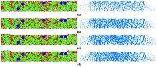Force chain evolution behavior of OGFC10. (a) Aggregate Particle and Force Chain-250cycle; (b) Aggregate Particle and Force Chain-1000cycle; (c) Aggregate Particle and Force Chain-1750cycle; (d) Aggregate Particle and Force Chain-2500cycle.