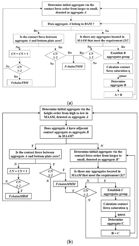 Flow diagram of single force chain identification. (a) I and II types of force chains (FchainsTBM and FchainsTBM represent I and II type force chains, respectively). (b) III and IV types of force chains (FchainsMMM and FchainsMBM represent III and IV type force chains, respectively).