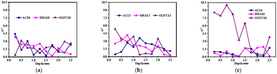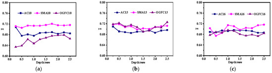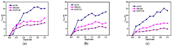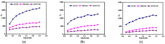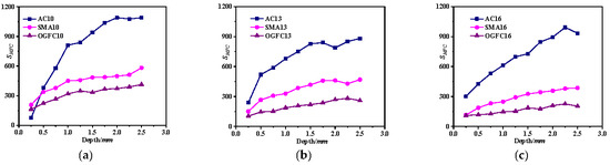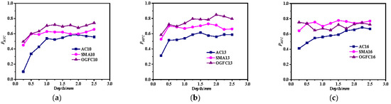 For AC-type asphalt mixtures, the average MFCAC of AC10 and AC13 initially decreases slightly and then stabilizes with an increase in penetration depth. However, that of AC16 remains relatively stable throughout the entire loading process. These results suggest that the skeleton structure of AC-type asphalt mixtures undergoes reorganization during the initial loading stage, especially in the case of small NMAS. This will make it easy to form MFCs with a longer length, some of which exhibit a relatively small alignment coefficient. With further loading, the skeleton structure is relatively stable after the asphalt mixture is compacted, so the remains relatively stable. For the SMA-type asphalt mixture, the of SMA10 and SMA13 remains relatively stable across all loading stages. However, the fluctuation range of of SMA16 is large at the initial loading stage, followed by a slight increasing trend in the later stage. This indicates that SMA mixtures with larger NMAS may have difficulty effectively contributing to load transfer when the pavement structure is relatively thin. For the OGFC-type asphalt mixture, the of OGFC10 increases slightly during the initial loading stage, and it remains relatively steady at the middle and late loading stages. The of OGFC13 and OGFC16 remains relatively stable during the whole loading process.