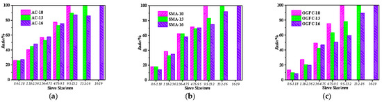 Figure 17 shows the proportion of aggregate participating in skeleton composition in different asphalt mixtures. It can be seen from Figure 17a that the Ratio for aggregates in the 0.6–1.18 mm range is about 25%. This means that these aggregates only play a role in filling the void within the skeleton for the AC-type asphalt mixture. For aggregates within 1.18–2.36 mm, the Ratio is close to 45%, suggesting that these aggregates are mainly used for void filling while also contributing slightly to skeleton formation. The Ratio for aggregate within 2.36–4.75 mm and 4.75–9.5 mm is approximately 50% and 80%, respectively. This implies that aggregates within these size ranges play a major role in skeleton composition, with only a minor contribution to filling the void. For aggregates larger than 9.5 mm, the Ratio exceeds 80%, indicating that nearly all such particles participate in skeleton formation. Similar trends are observed in SMA- and OGFC-type asphalt mixtures.