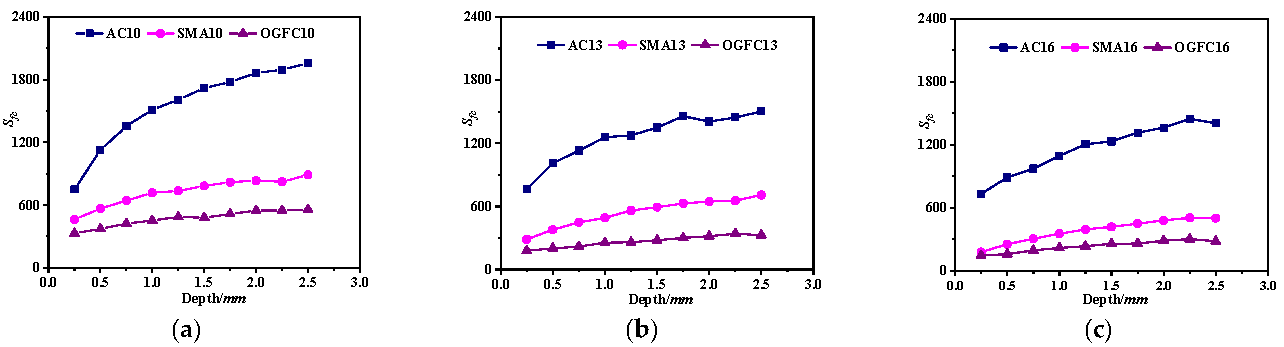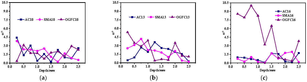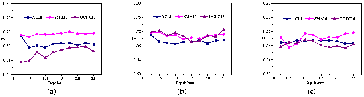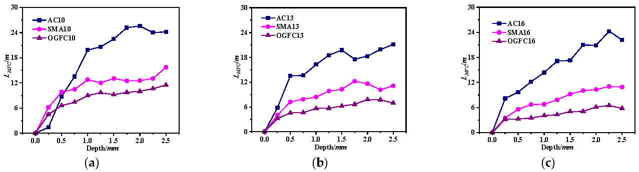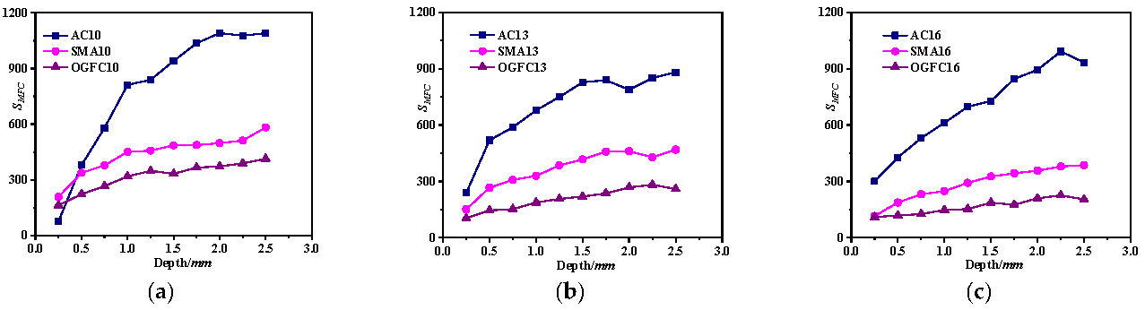 - Compared to SMA and OGFC, the MFC network in AC mixtures exhibits greater complexity and lower efficiency in transferring external loads. For all asphalt mixtures, the MFC structure evolves in a direction that is conducive to the transfer of external loading.