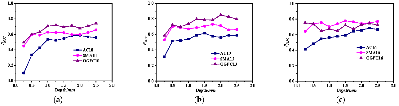 - Compared with SMA and OGFC, AC-type asphalt mixtures have a greater number of force chains under the same NAMS. Although AC-type asphalt mixtures have more MFCs, both SMA and OGFC show a higher PMFC throughout the entire loading process.