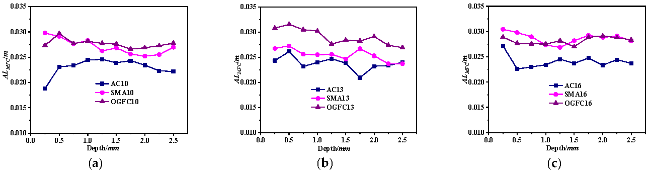 - In AC-type asphalt mixtures, the skeleton undergoes structural reorganization during the initial loading stage, especially in the case of small NMAS. This makes it easy to form MFCs with a longer length, which in turn leads to a relatively small alignment coefficient in a portion of the MFC.