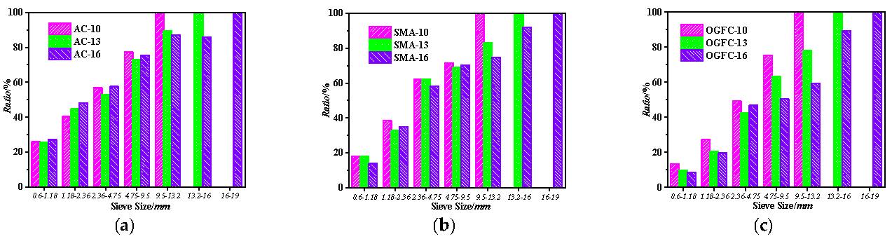 - Aggregates within the 1.18–2.36 mm range primarily serve to fill voids in the skeleton, with only minor participation in skeleton formation. Those between 2.36–4.75 mm and 4.75–9.5 mm contribute mainly to skeleton composition, while playing a limited role in void filling. Aggregates larger than 9.5 mm participate almost entirely in skeleton construction.