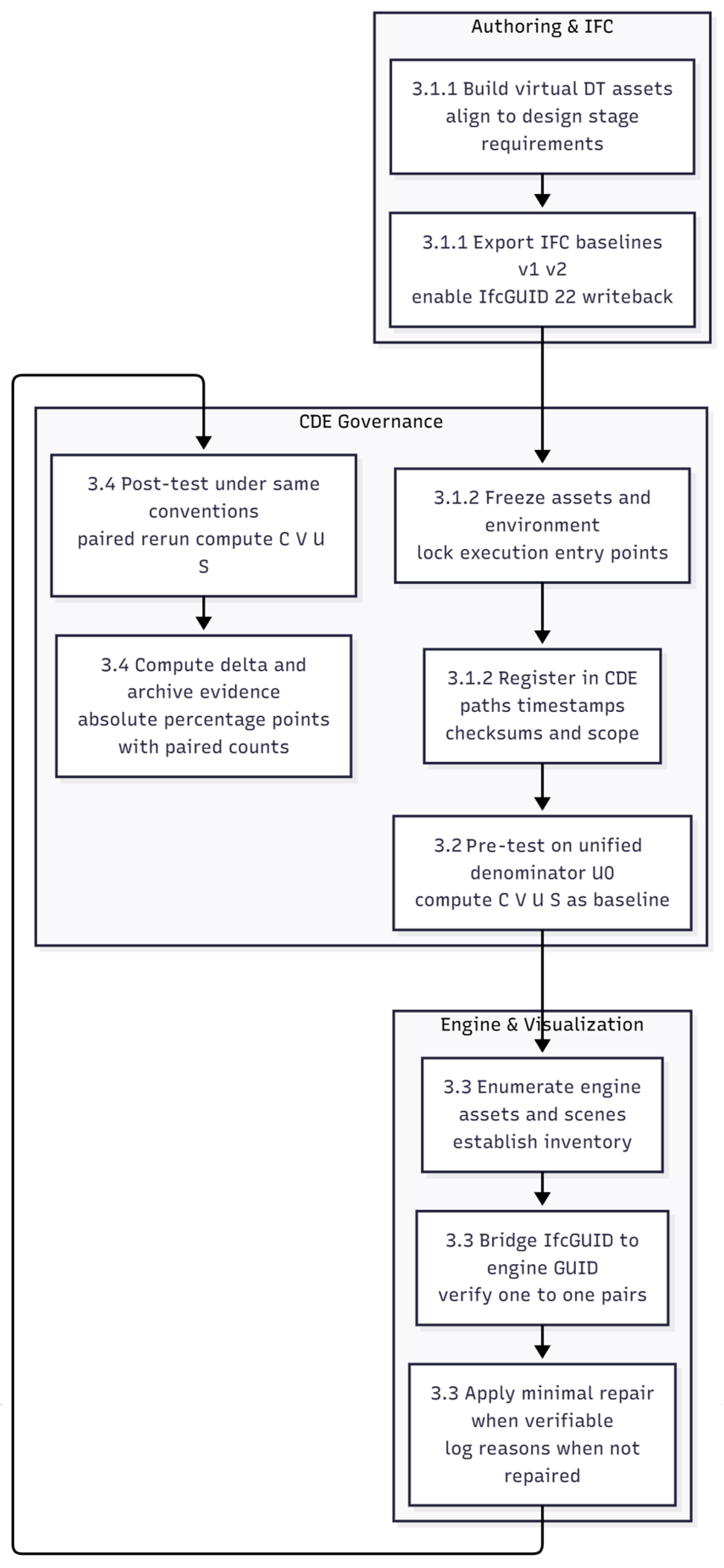 Section 3.1.1). Second, we explain how we freeze the export and consumption pipelines and designate IFC as the single source of truth, ensuring that design-stage BIM and digital-twin assets form a stable object set for pre- and post-tests (