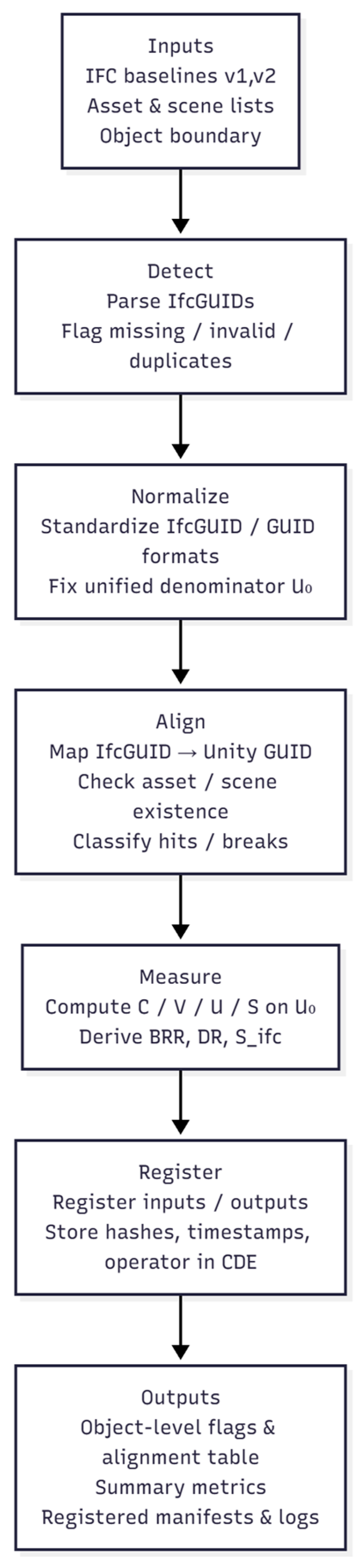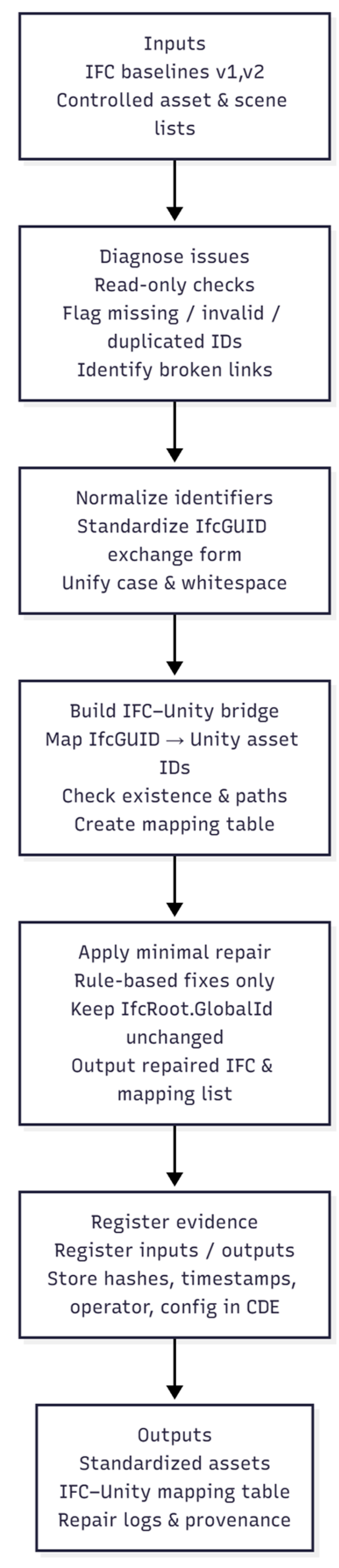 28]. Our work not only quantifies IfcGUID completeness, validity, uniqueness, and stability, but it also explicitly addresses the ambiguity “engine-internal ID change does not equal object change” by establishing a stable mapping from Unity meta unique IDs to IfcGUID-22 and recording mapping details, baselines, and logs in the Common Data Environment (CDE), turning these “do it right” conditions into a reusable minimal constraint [