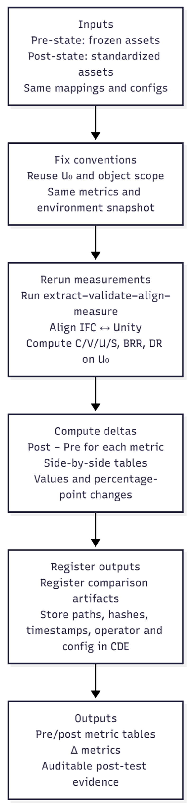 Under the same denominator U0 and the same interpreter and rules as the pre-test, we recompute the four primary metrics, keeping IFC as the sole data source and maintaining read-only constraints. Relative to the pre-test, the post-test enables upgraded bridging and probes on the interoperability side, expanding the enumeration/recording of consumption-side object pairs and introducing finer recognition/break statistics and provenance/attribution outputs. This yields a more complete interoperability view without changing the definitions or conventions of R1 Completeness, R2 Validity, R3 Uniqueness, or R4 Stability, ensuring direct comparability with the pre-test.