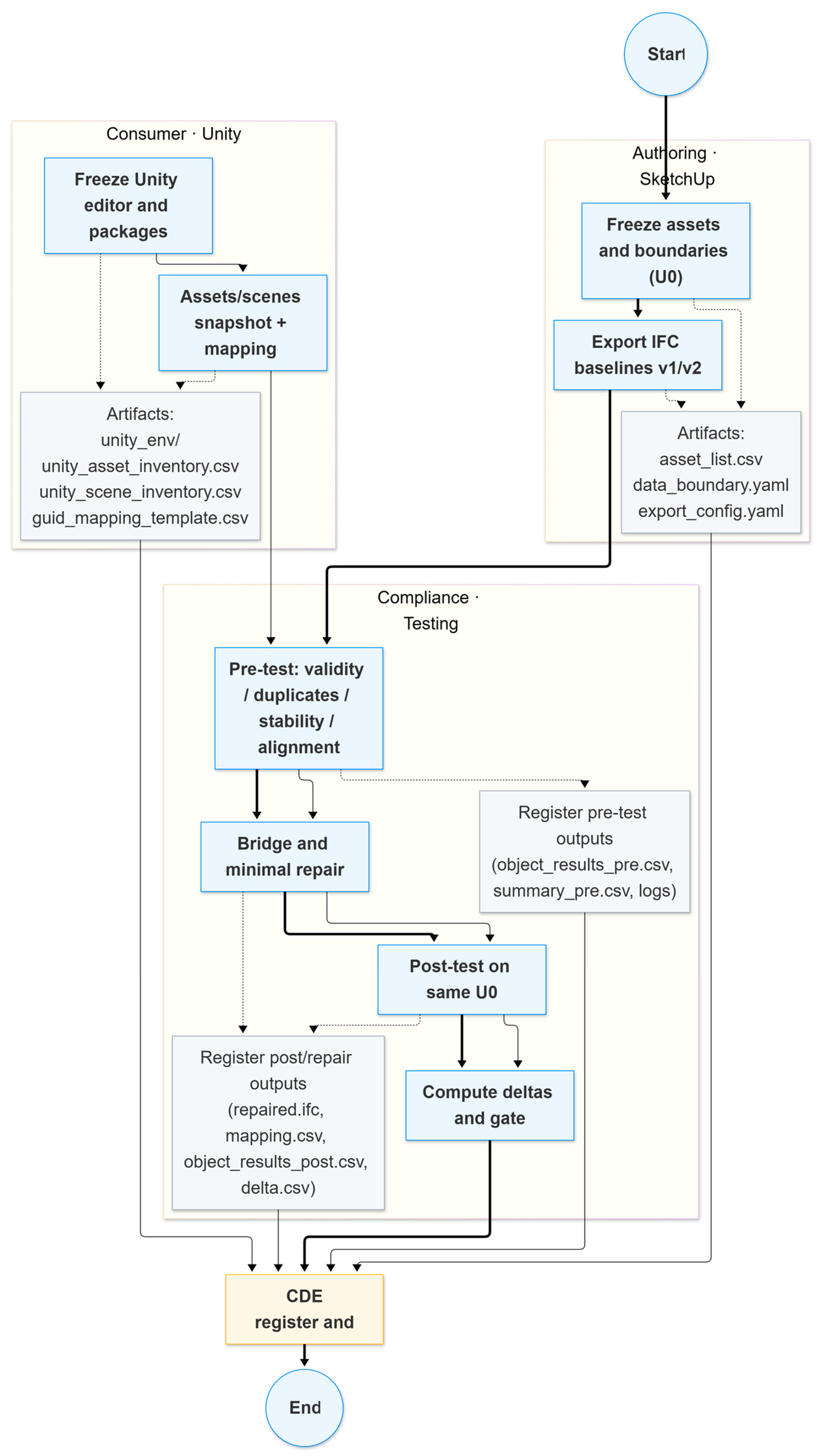 . The export pipeline is fixed as SketchUp → IFC with a single, consistent strategy so that IFC serves as the sole data source. Under identical environment and configuration settings, two baselines (v1/v2) are exported to support subsequent checks on GlobalId stability. All write operations are confined to tool-generated containers, leaving the original project files unchanged. In a single controlled registration step, we record the baselines, inventories, environment snapshots, and checksums in the CDE to support reruns and audits. Key baselines and locks (coordinates/units, naming and hierarchy, export channel, environment snapshot, and CDE register) are summarized in