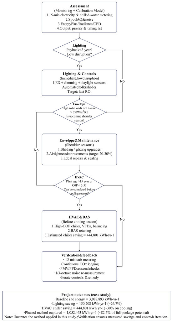 The assumptions adopted in our model inputs and scenario definitions serve three interrelated purposes: (a) model validation, where conservative, measurement-anchored inputs (measured schedules, monitored internal gains and instrument error bounds) are used exclusively to calibrate simulations against observed energy use and meet accepted calibration metrics; (b) energy and carbon optimization, where technology and retrofit scenario assumptions (e.g., chiller COP, lighting efficacy, glazing U-values) are set to plausible vendor/market values and explored in sensitivity analyses to estimate technical potential; and (c) framework generalization, where a small set of normative decision thresholds (for example, payback < 3 years or envelope U-value benchmarks) are proposed to guide practical sequencing while remaining adaptable to local economics. These assumption classes are embedded in the demand-driven phased retrofit method advanced here: monitoring and calibrated simulation produce a ranked, time-phased implementation plan that prioritizes short-payback, low-disruption measures first (lighting + controls), schedules envelope interventions in favorable shoulder seasons, and completes major plant and BAS upgrades immediately prior to the cooling season (Figure 2). Applied to the case study, this sequencing enabled early capture of the majority of full-package potential (≈80–85% of modeled deep-retrofit savings) while avoiding prolonged shutdowns—for example, an early chiller replacement completed before the cooling season yielded an observed ≈30% reduction in plant cooling energy, and LED + daylight controls reduced lighting consumption by ≈26.7%. By coupling clear assumption purpose, rigorous calibration and post-implementation metering, the method offers a transferable, data-driven framework for achieving large fractions of full-package energy and carbon savings with substantially lower short-term disruption and improved cash-flow management.