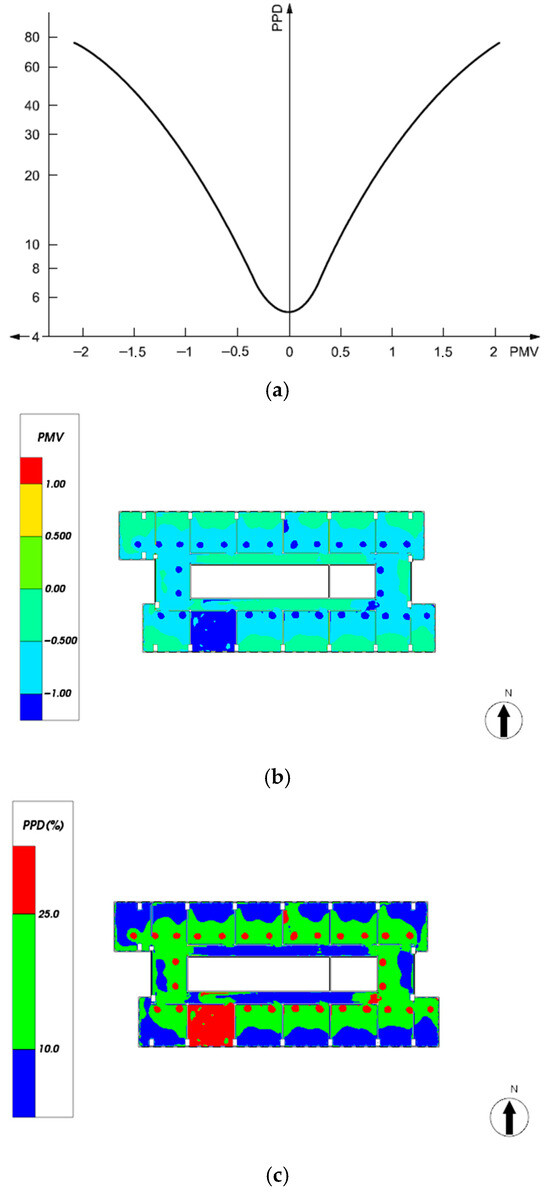 Indoor Thermal Comfort Evaluation Diagram. (a) The relationship between PPD and PMV; (b) PMV distribution at pedestrian height; (c) PPD distribution at the height of the railing.