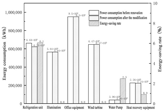 The aging of building HVAC systems has led to reduced energy efficiency and a significant decrease in unit COP (Coefficient of Performance). This study implemented renovations using high-COP air conditioning units that meet energy-saving and low-carbon standards, along with replacing the circulating water pumps. The smart HVAC system not only reduces energy consumption but also enhances indoor comfort, creating a more eco-friendly and healthy environment for occupants. As shown in Table 9 and Figure 10, the renovation achieved a 6.1% energy-saving effect on the refrigeration units.