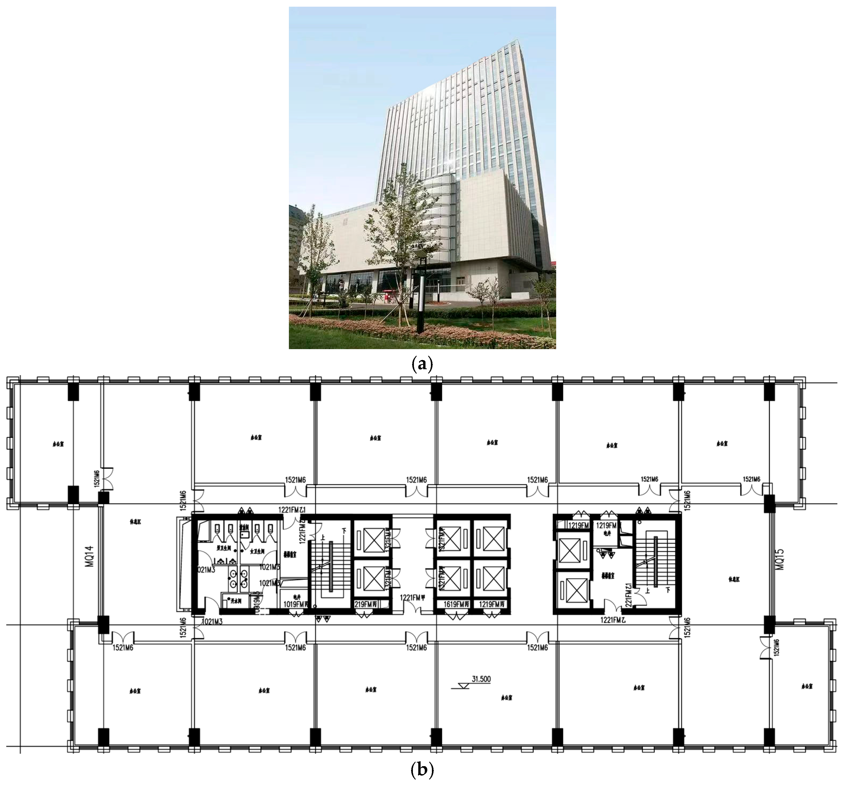 This study examines a 5A-rated office building located in Beijing at 39.80° N, 116.47° E. The 15-year-old building has a total floor area of 44,000 m2, with 29,000 m2 dedicated to air-conditioned space, and consists of 21 above-ground floors and 3 underground levels. The building peak cooling design load is 3550 kW and the peak heating design load is 3000 kW (design basis). The installed mechanical system is composed of multiple chillers and terminal units: for example, individual AHU/terminal units typically provide ~81 kW cooling capacity and ~68 kW heating capacity per unit (rated). Originally completed with state-level awards for its fully equipped facilities, the building has experienced energy consumption spikes and uneven indoor temperature distribution in recent years, largely due to aging equipment.