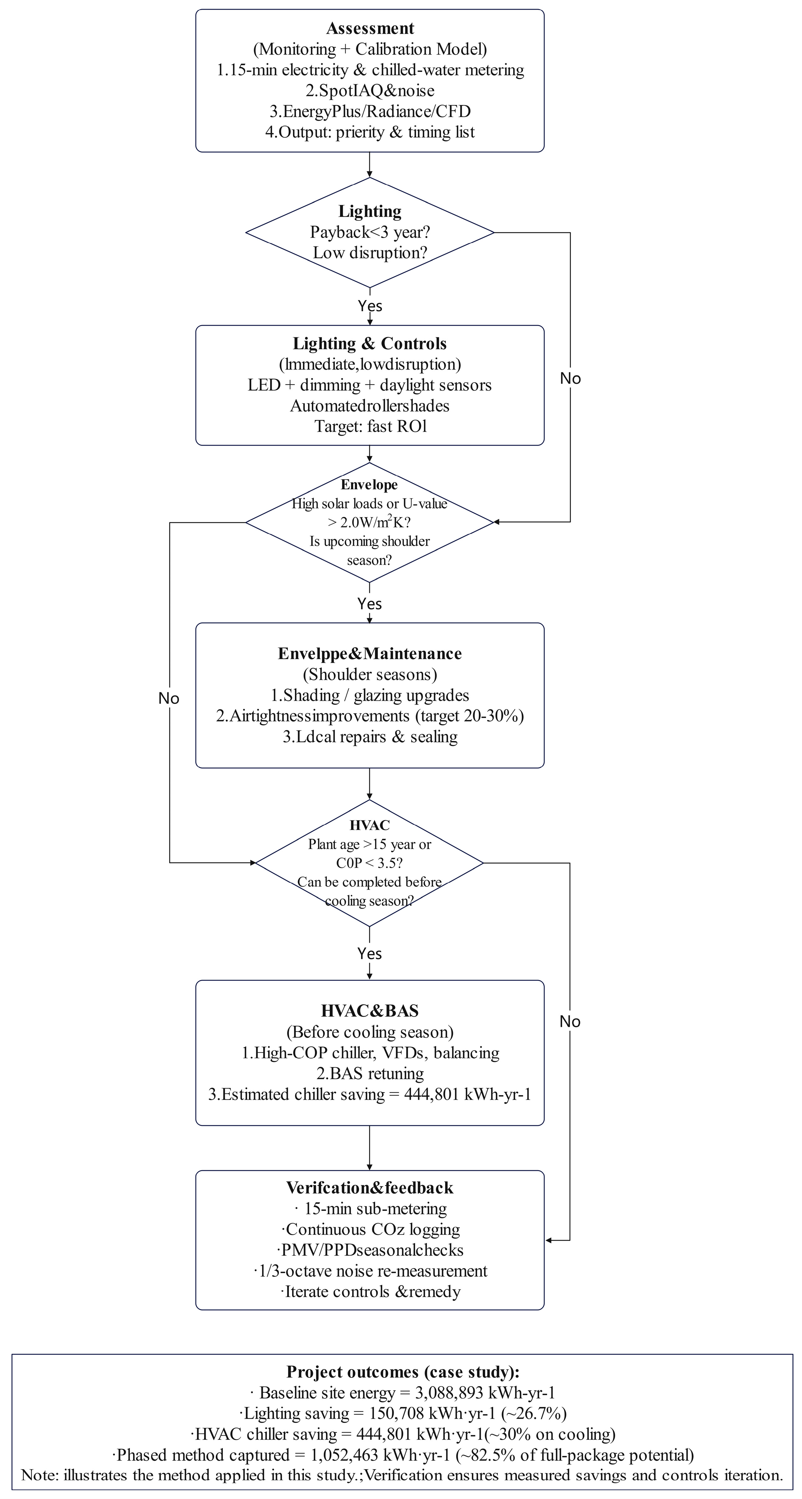Figure 2). Applied to the case study, this sequencing enabled early capture of the majority of full-package potential (≈80–85% of modeled deep-retrofit savings) while avoiding prolonged shutdowns—for example, an early chiller replacement completed before the cooling season yielded an observed ≈30% reduction in plant cooling energy, and LED + daylight controls reduced lighting consumption by ≈26.7%. By coupling clear assumption purpose, rigorous calibration and post-implementation metering, the method offers a transferable, data-driven framework for achieving large fractions of full-package energy and carbon savings with substantially lower short-term disruption and improved cash-flow management.