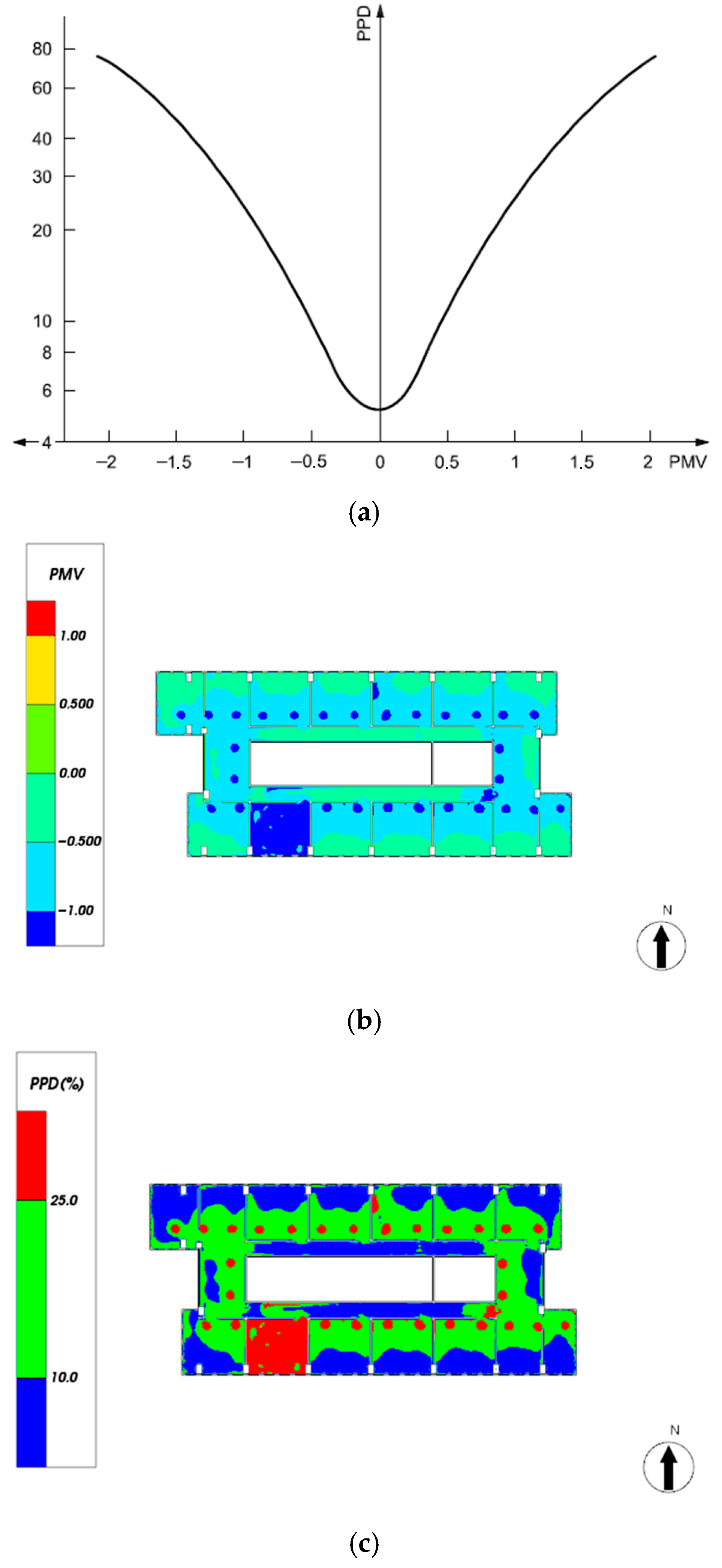 Figure 4 documents the annual distribution of PPD and PMV values in a typical office, pinpointing areas of concern that necessitate targeted retrofit interventions to enhance occupant comfort and optimize energy efficiency.