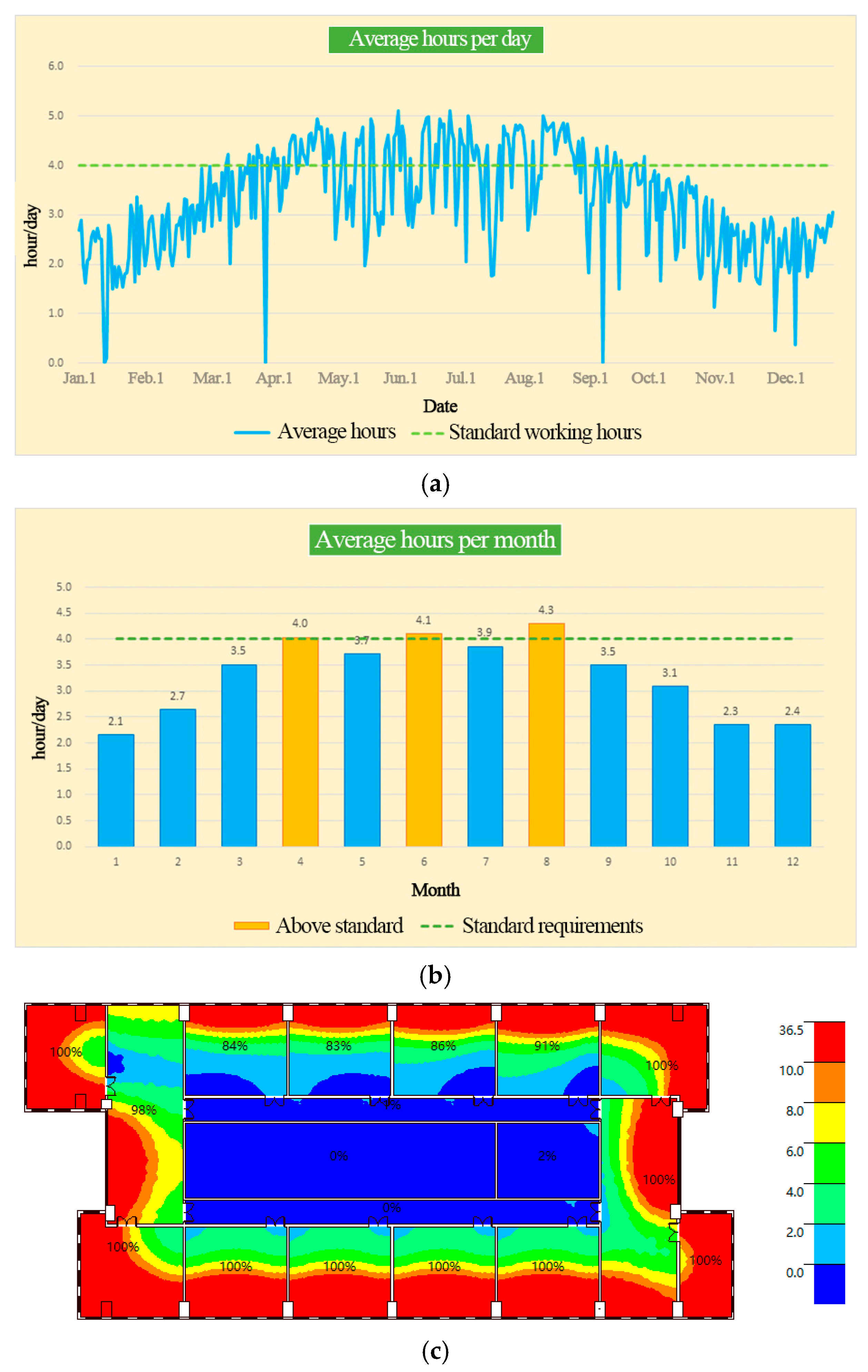 Figure 5 shows the dynamic daylight analysis of a typical floor. These diagrams clearly reflect the building’s daylighting performance and compliance status throughout the year, highlighting areas of insufficient light and those that are overly exposed. These intuitive insights are essential for developing targeted renovation strategies aimed at enhancing natural lighting while reducing excessive solar radiation.
