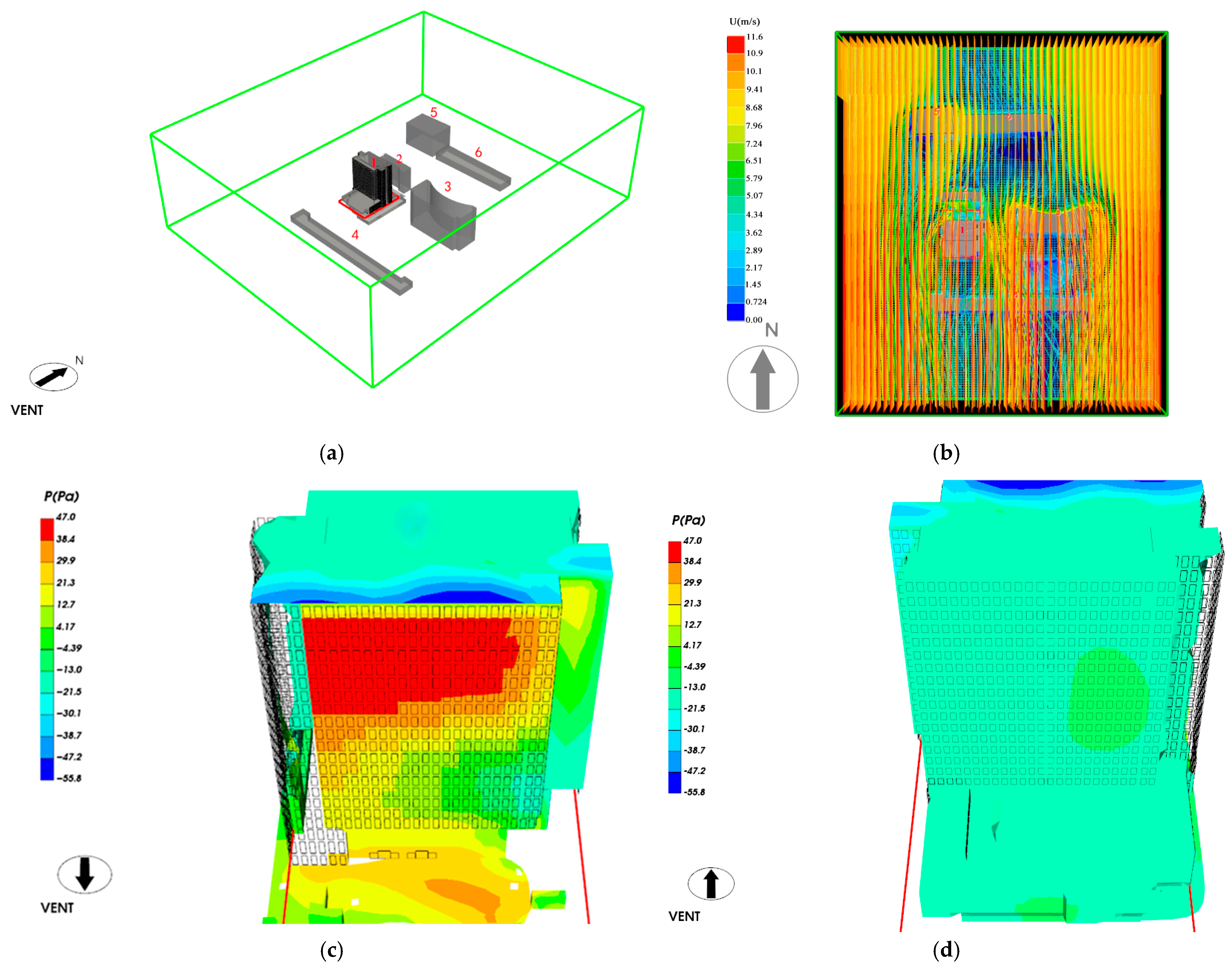 Figure 7a, the numerals denote the tested buildings in the computational domain; specifically, ‘1’ indicates the subject building analyzed in this study (see