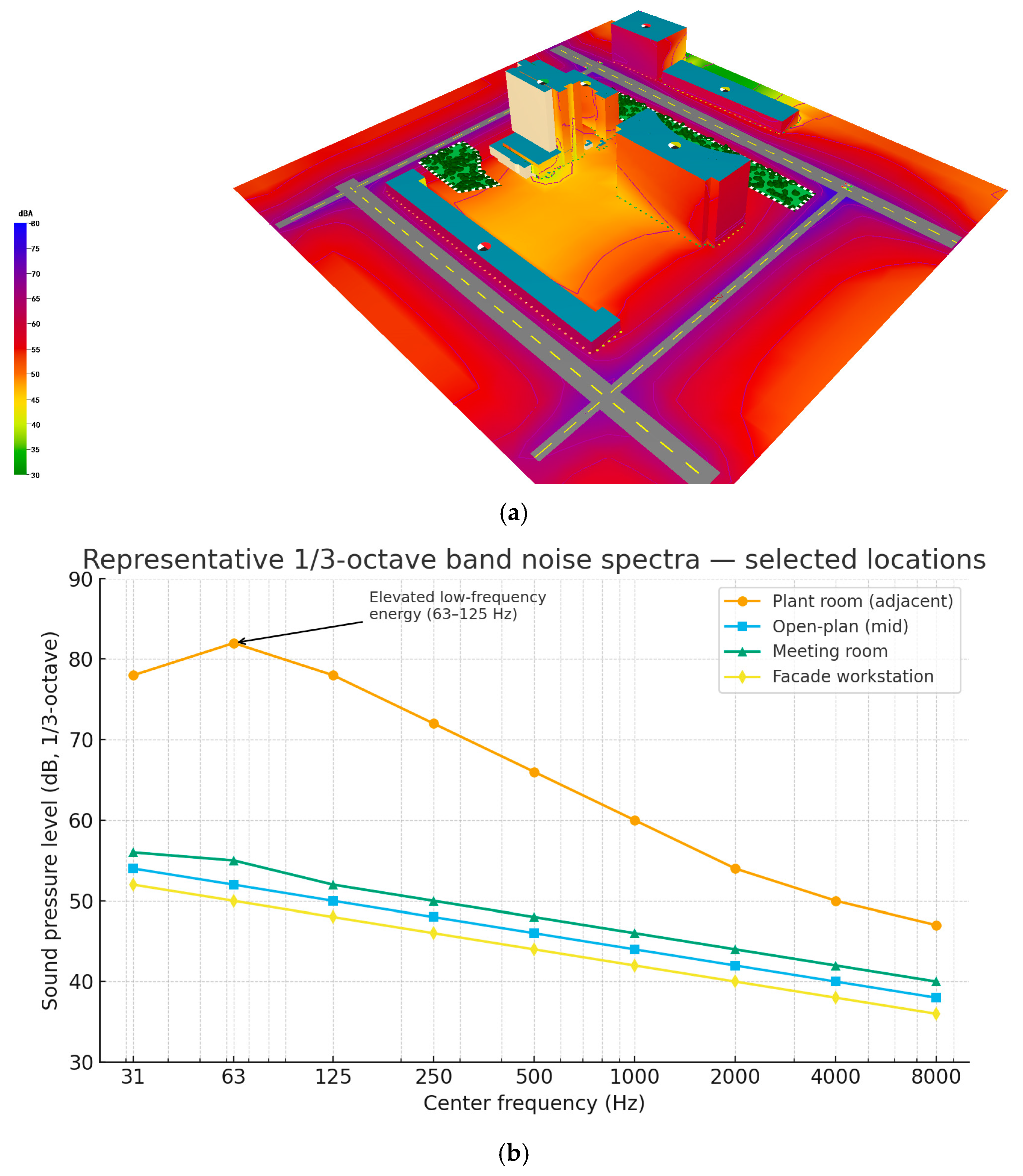 To strengthen the acoustic diagnosis beyond single-number A-weighted levels, we conducted 1/3-octave band spectral analyses for key locations, including areas adjacent to plant rooms, open-plan mid-floor spaces, meeting rooms, and façade workstations. These spectra combined available spot-measurement data from the on-site noise survey with band-aggregated reconstructions where complete spectral data were unavailable.