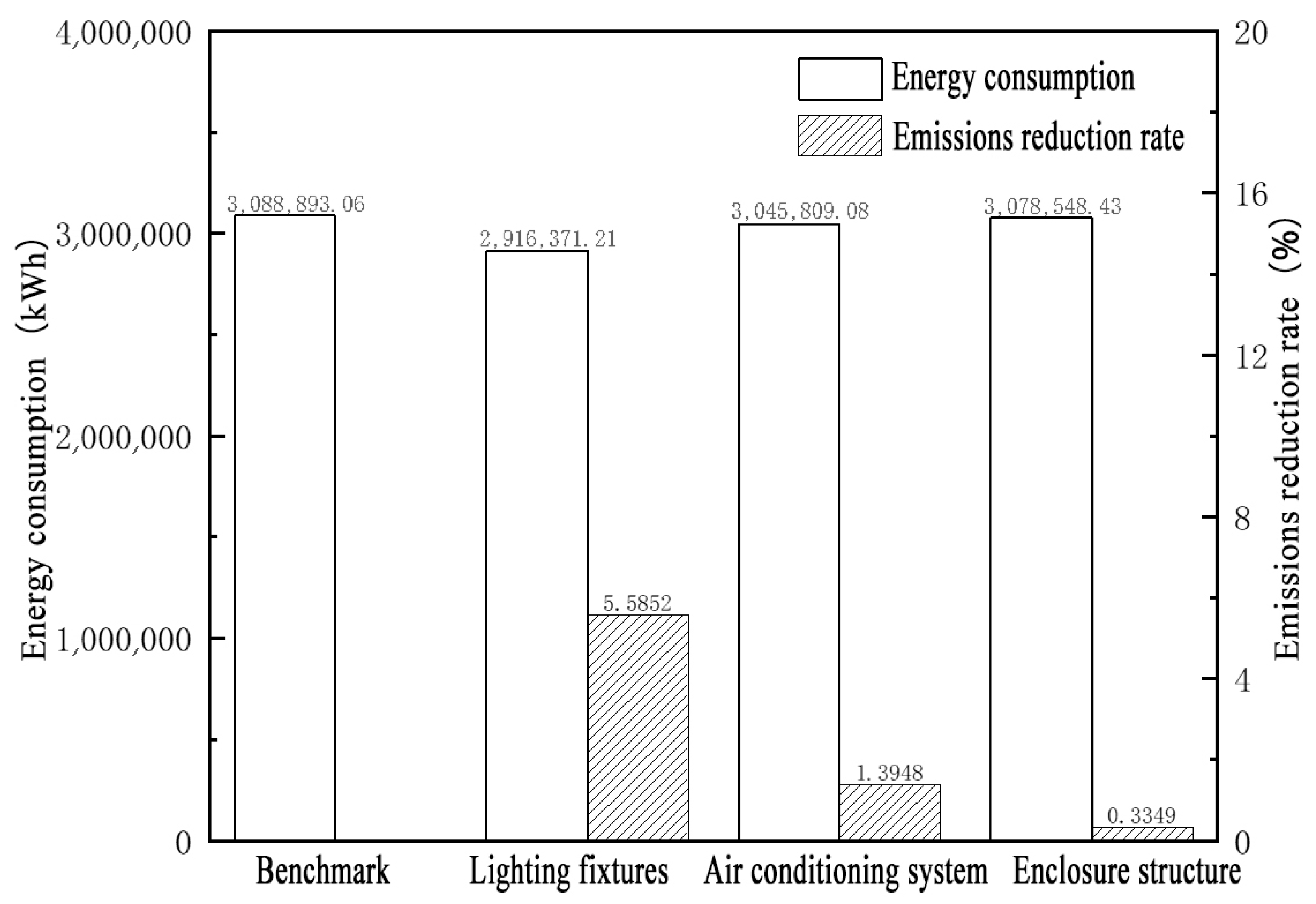 Figure 11. It can be seen that the impact of building lamp renovation on energy saving and emission reduction is the biggest, while the optimization of thermal insulation of the envelope has the least impact on the final effect.