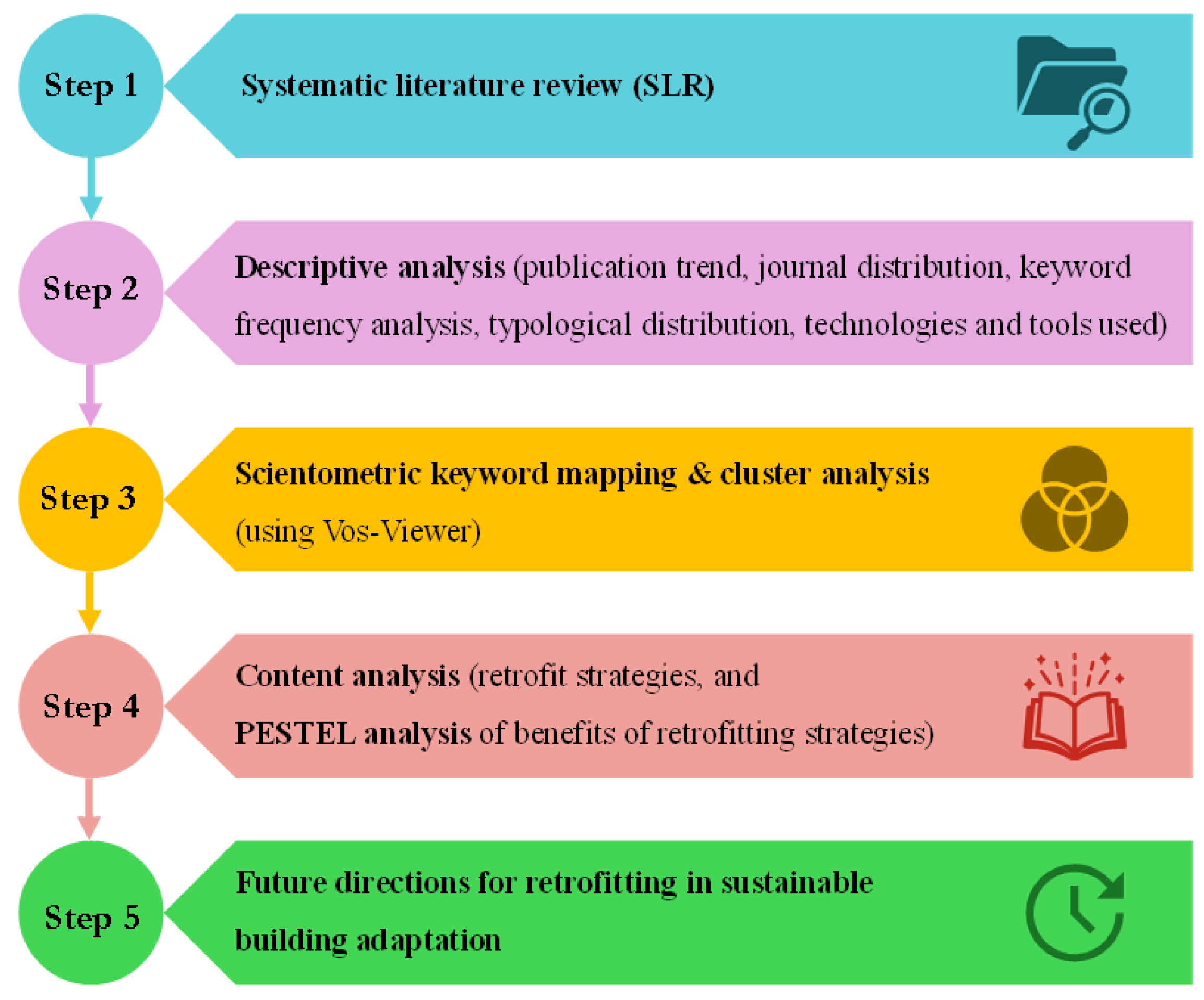 As illustrated in Figure 1, the first stage begins with a systematic literature review (SLR) conducted to identify the relevant studies. Originating from medical research, the SLR method offers a structured framework for compiling and synthesising findings across studies. It ensures methodological rigour, enabling researchers to map current knowledge, uncover gaps, and guide future inquiry. SLR includes various research activities, among which the search strategy is crucial as it forms the basis of the article retrieval process. As such, in this study, the search strategy focuses on key retrofit-related terms applied specifically to titles in the Scopus database to ensure specificity and manageability. The second stage involves descriptive analysis, which provides a foundational understanding of the research landscape. It explores variables such as publication trends over time, the distribution of papers across journals, study typologies, keyword frequencies, technologies employed, and building typologies. This broad overview lays the groundwork for deeper thematic exploration. The third stage employs scientometric keyword mapping and cluster analysis using VOSviewer (version 1.6.20) software [26]. This process identifies co-occurring keywords that help structure the subsequent content analysis. In the fourth stage, retrofit strategies are categorised into thematic groups, and as an established framework, political, economic, social, technological, environmental, and legal (PESTEL) is applied to guide impact classification. The fifth and final stage identifies patterns in methodological evolution and captures the emergence of technologies such as Artificial Intelligence (AI), Digital Twins (DTs), and Circular Economy (CE). The subs section below reflects the details about the SLR process that underpins this study.