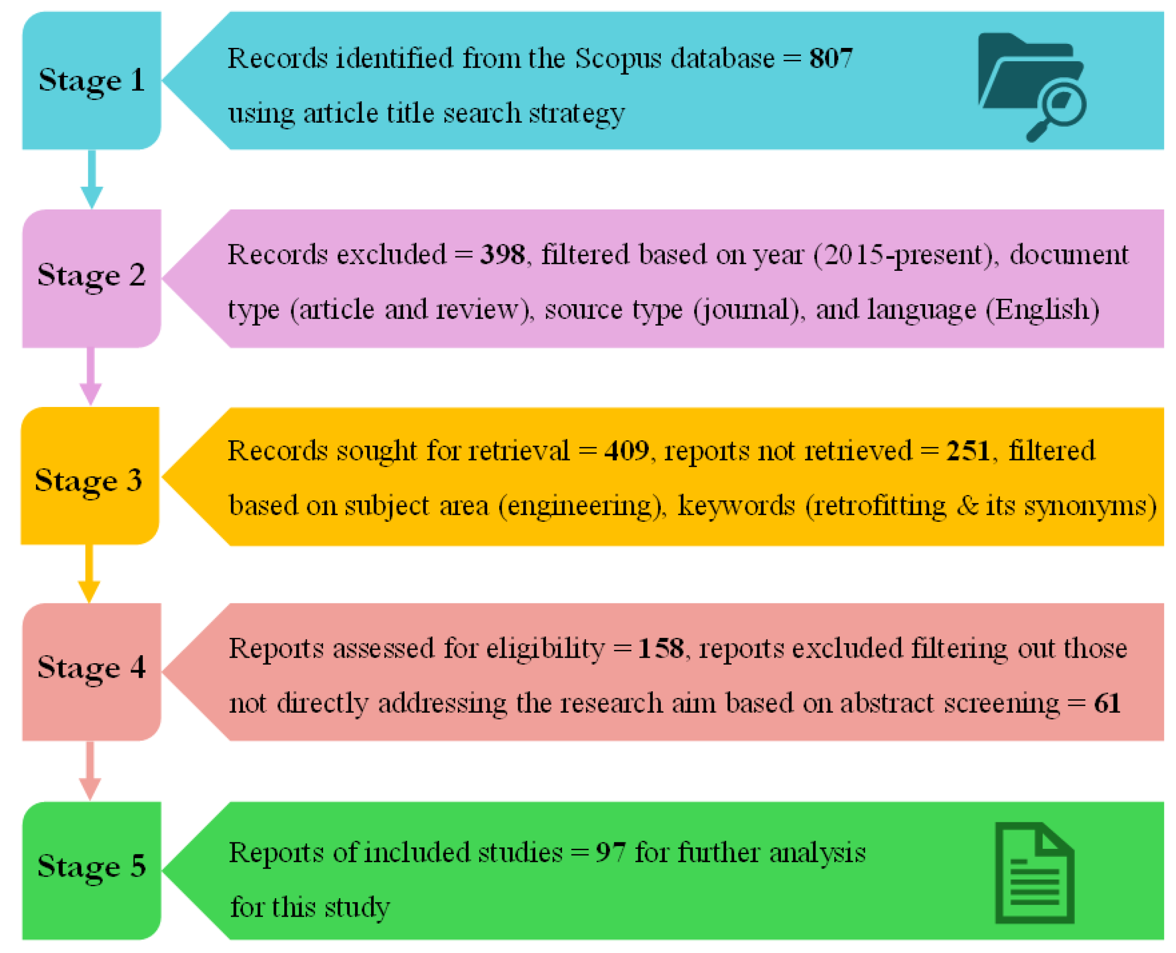This filtration step yielded 409 documents for further evaluation in stage 3, where 251 records were removed after screening for disciplinary alignment, ensuring that only articles from the engineering, built environment, and architectural sciences were retained. Studies from fields such as pure mathematics, biology, or unrelated computer sciences were excluded, as their methodological or theoretical approaches did not align with the research focus. This stage also refined results by checking for conceptual alignment, ensuring that retrofitting was not mentioned only tangentially. This left 158 documents for eligibility assessment in the next stage.