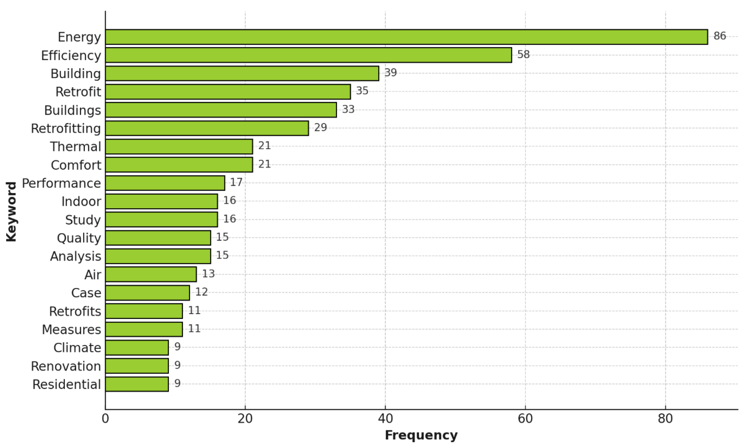 Figure 6 shows the most frequent keywords in the 97 retrofit-related papers. “Energy” and “efficiency” appear most often, with 86 and 58 mentions, underlining the primary aim of reducing energy use through retrofitting. Words like “building”, “retrofit”, and “retrofitting” confirm the focus on improving existing structures. Keywords such as “thermal”, “comfort”, and “indoor” highlight growing attention to occupant well-being, especially after COVID-19, as noted in studies by Gholampour et al. [31] and Mapfumo et al. [42]. The presence of terms like “analysis”, “study”, and “case” points to the dominance of evidence-based approaches. Overall, the keyword trends reflect the dual emphasis in retrofit research on technical efficiency and occupant comfort, supporting key themes such as passive strategies, digital modelling, and thermal performance.