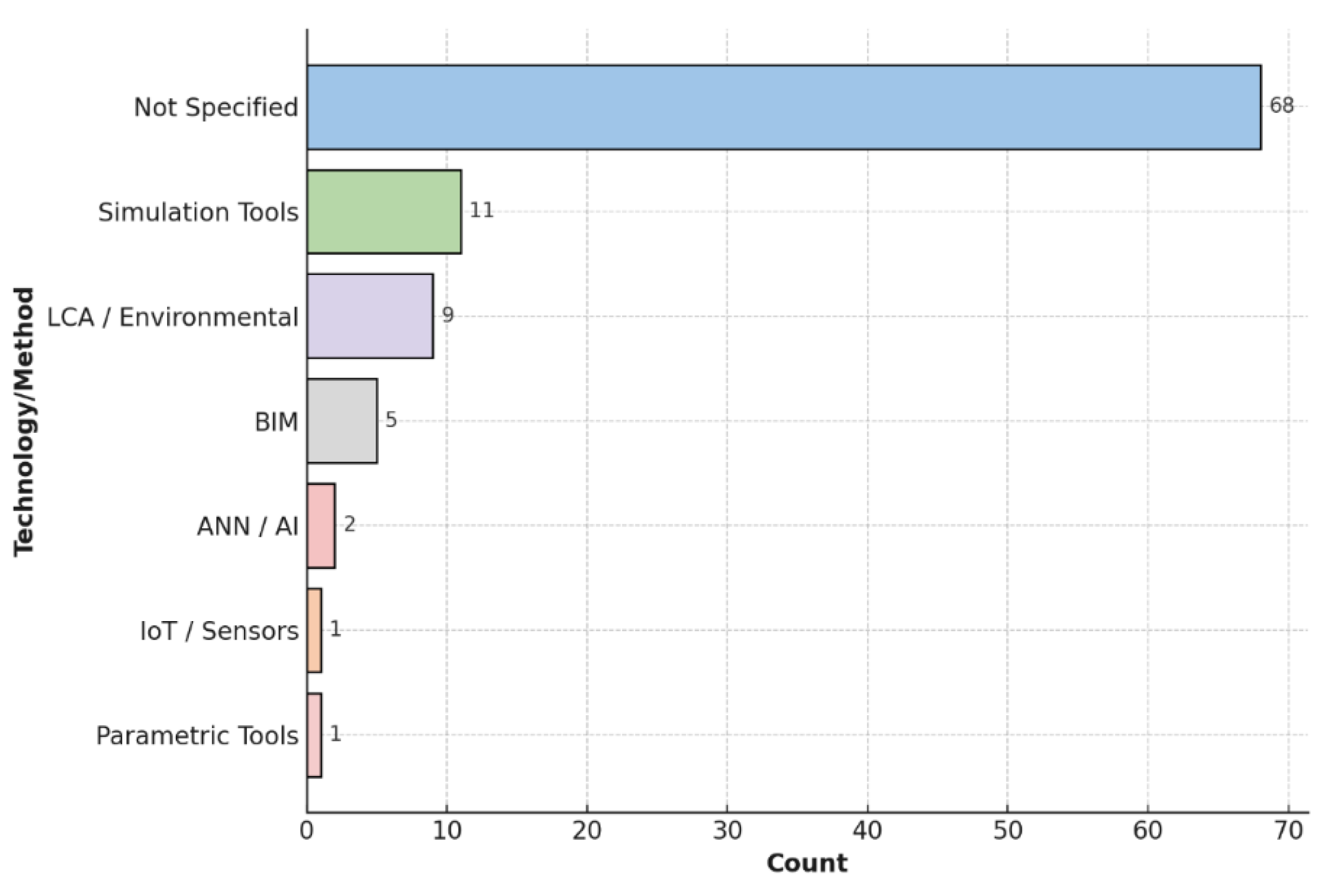 Figure 9. Distribution of technology and methodological tools applied in retrofitting studies.