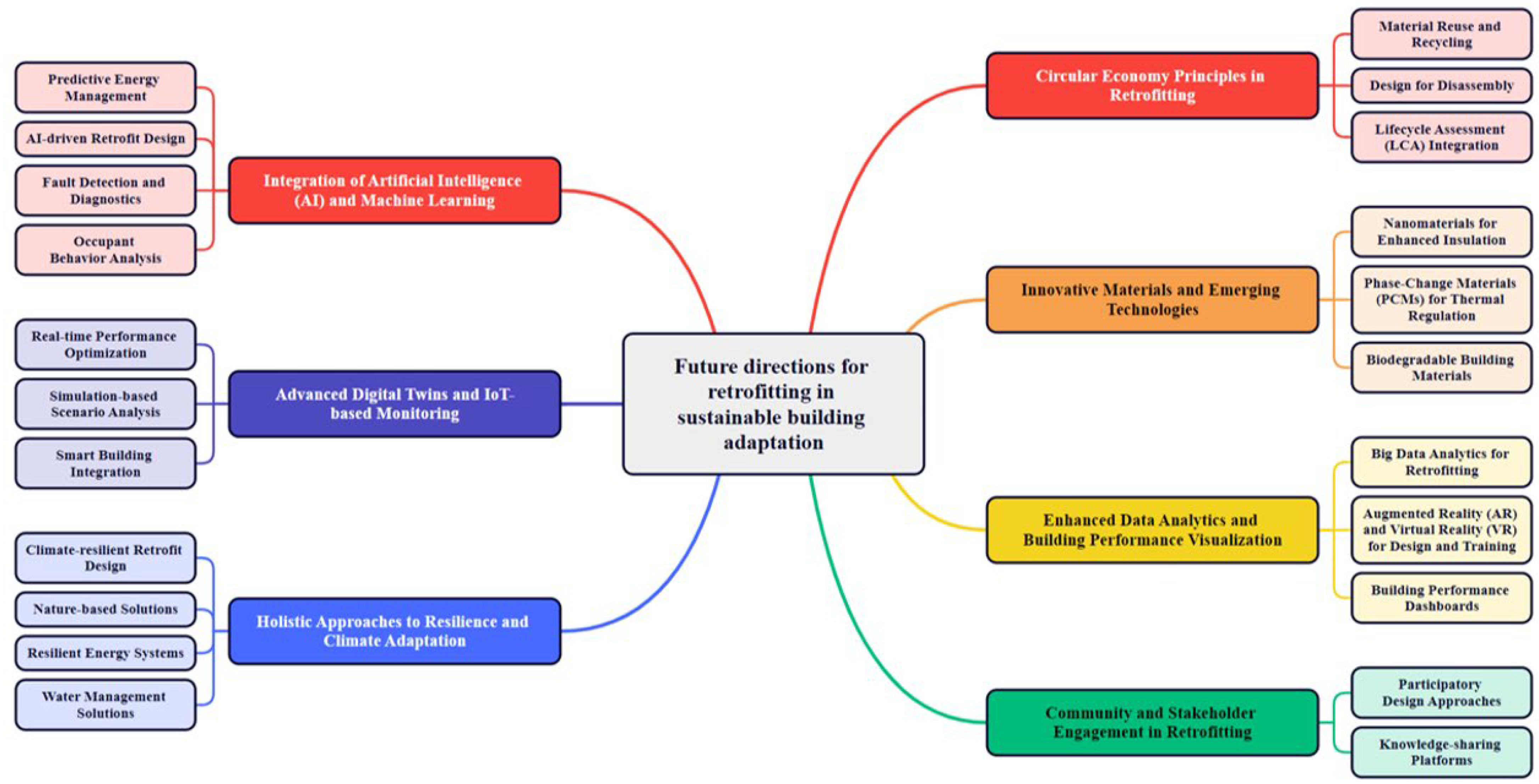 Policies and user behaviour also figure heavily into sustainability outcomes. Shaikh et al. [44] provide policy recommendations for promoting retrofits in Pakistan, advocating passive design and envelope upgrades as cost-effective measures to meet national climate targets. However, Peel et al. [80] found that even well-intended passive retrofit programmes in UK social housing achieved limited success when social factors were ignored. They further added that unclear responsibilities between landlords and tenants and low occupant awareness led to suboptimal use of the new passive features. This indicates that occupant engagement and education are vital, and even high-performance retrofits can fail to deliver sustainability gains if users override or misuse systems. Several studies also assess the life-cycle environmental impacts of retrofits. Rababa and Asfour [81] showed that certain material-heavy retrofits can inadvertently raise embodied carbon, offsetting some operational savings, and they propose using recycled materials and efficient design to cut both operational and embodied emissions. In line with this, Citadini de Oliveira et al. [8] integrative review highlights strategies like material reuse, on-site generation, and community engagement as keys to maximising the ecological benefits of retrofitting. As such, the green cluster illustrates that achieving sustainability through retrofits requires a holistic framework, one that integrates energy efficiency with health indicators, climate adaptation, lifecycle carbon reduction, and social inclusion. Such an approach ensures that retrofit initiatives not only reduce utility bills but also tangibly contribute to global sustainability targets (such as several of the UN Sustainable Development Goals).