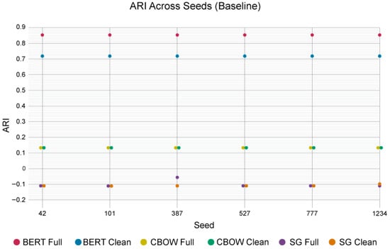 Independent cross-environment check: In addition to deterministic settings and artefact logging, we verified output stability across three archived runs under two distinct Python stacks. The archived machine snapshots document materially different libraries, for example, Torch 2.5.1 with Transformers 4.56.0 versus Torch 2.2.2 with Transformers 4.51.3; yet, the pipeline reproduced the same ARI values and cluster assignments for BERT and CBOW on both FULL and CLEAN. Skip-gram likewise produced identical outputs across environments for any fixed seed; its variability arises only across seeds. The snapshots include configuration and code hashes, permitting a byte-level audit of all differences. This constitutes an environment-level reproducibility check beyond a single software setup. Byte-identical results across heterogeneous hardware are not claimed.