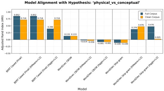 We report paired contrasts for each model under the two corpus conditions (Δ = CLEAN − FULL). Fine-tuned BERT aligns closely with FULL’s conceptual vs. physical gold split and remains strong on CLEAN. Removing definitional sentences reduces BERT’s separability by a modest margin while slightly improving Skip-gram on physical terms. External similarity shows corpus-dependent parity between BERT and Skip-gram. On CLEAN, WordSim-353 marginally favours Skip-gram; on FULL, fine-tuned BERT is slightly higher.