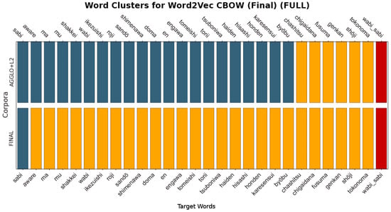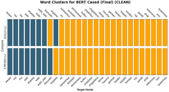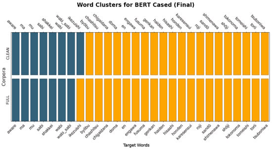 We created two parallel corpora that serve as an explicit experimental variable. Each corpus has tailored preprocessing based on the model’s specific computational needs. The FULL corpus comprised 1,975,868 words for BERT processing and 1,890,739 words for Word2Vec CBOW training; after definitional cleaning, the CLEAN corpus was reduced to 1,968,370 words for BERT (a 0.38% decrease) and 1,887,234 words for CBOW (a 0.19% decrease). FULL retains all sentences after basic normalisation (e.g., tokenisation and lower-casing). CLEAN was produced by a dedicated cleaning script that implemented the full pipeline described in the earlier version of this study: sentence segmentation, tokenisation, lower-casing and punctuation removal (for distributional training), lemmatisation and part-of-speech tagging, hybrid stop-word removal, and retention of Japanese tokens. Crucially, the script detects and removes definitional and glossary-like sentences using regular expressions over copular and appositive frames (e.g., “X is a Y,” “X refers to Y,” “X is defined as …,” “X means …,” “X, a Y”).