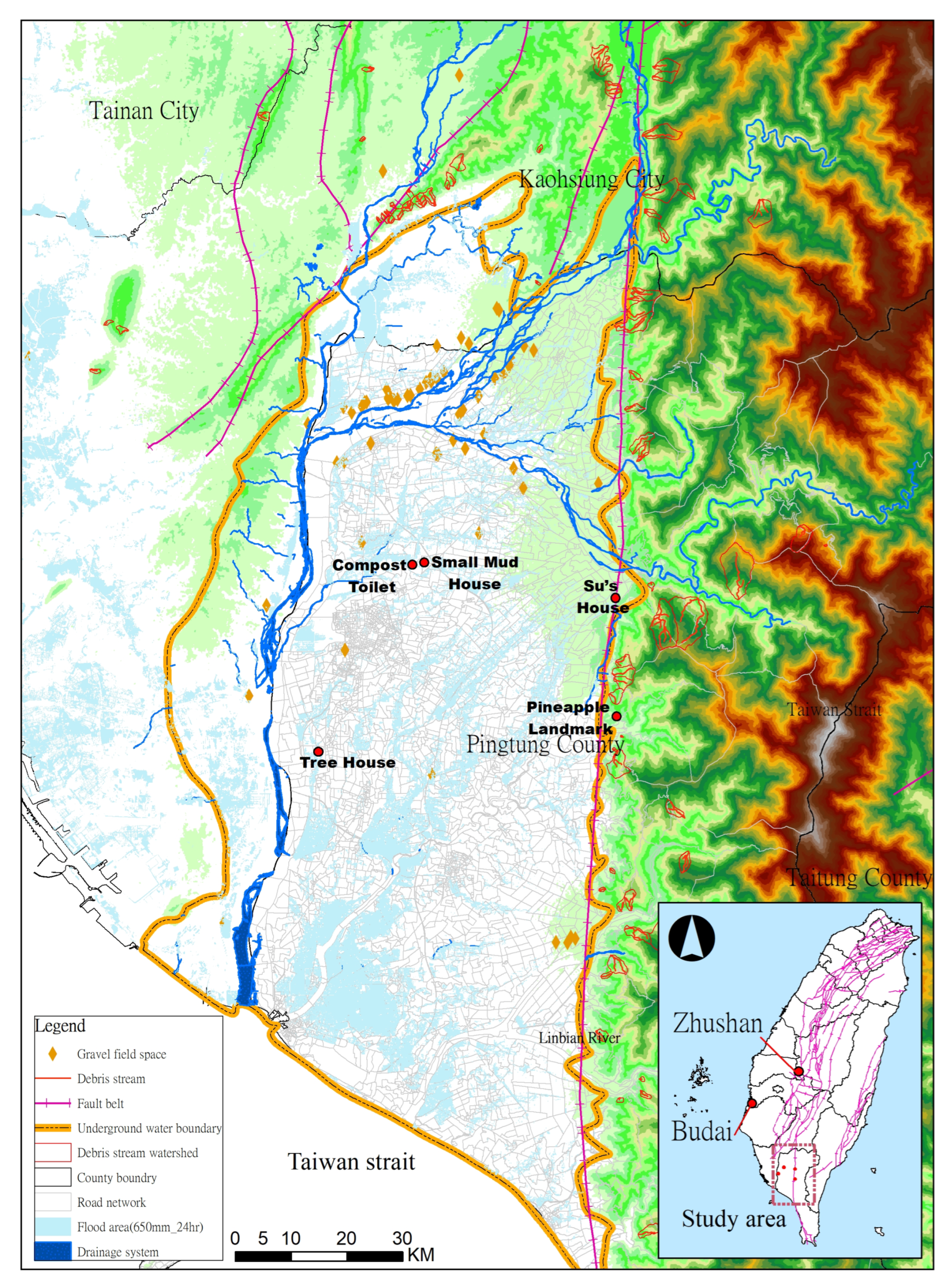 - Tsai, S.-C.; Lee, S.-H. Disaster-Resilient Communities on Flood Plains and Their Agricultural Regeneration: A Case Study in Meinong Plain, Taiwan. Water 2022, 14, 1736. [Google Scholar] [CrossRef]