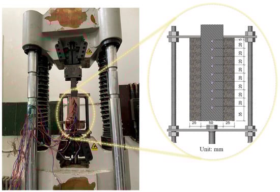 After deterioration, specimens underwent a double shear test using a computer-controlled electro-hydraulic servo universal testing machine (Figure 6). Loading was displacement-controlled at 0.2 mm/min. An L-shaped stiffener was attached to one side of the CFRP to prevent failure of the non-tested face. During testing, the interface failure mode, interfacial load capacity, and tensile-direction strain distribution of the CFRP were recorded.
