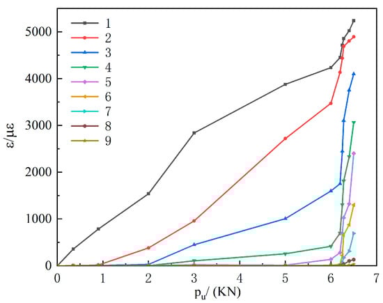 Measured curves were consistent across specimens. Therefore, Group M0 is presented as representative (Figure 11). Prior to failure, load–strain responses at all gauge locations were linear. When the applied load was below 6 kN, bond stresses were concentrated near the loading end (gauges 1–5). Once the load exceeded 6 kN, the bond stress gradually shifted toward the free end until failure occurred. The relatively low strain values at the free end at failure indicate limited interfacial load capacity in that region and rapid debonding between the CFRP and the concrete.