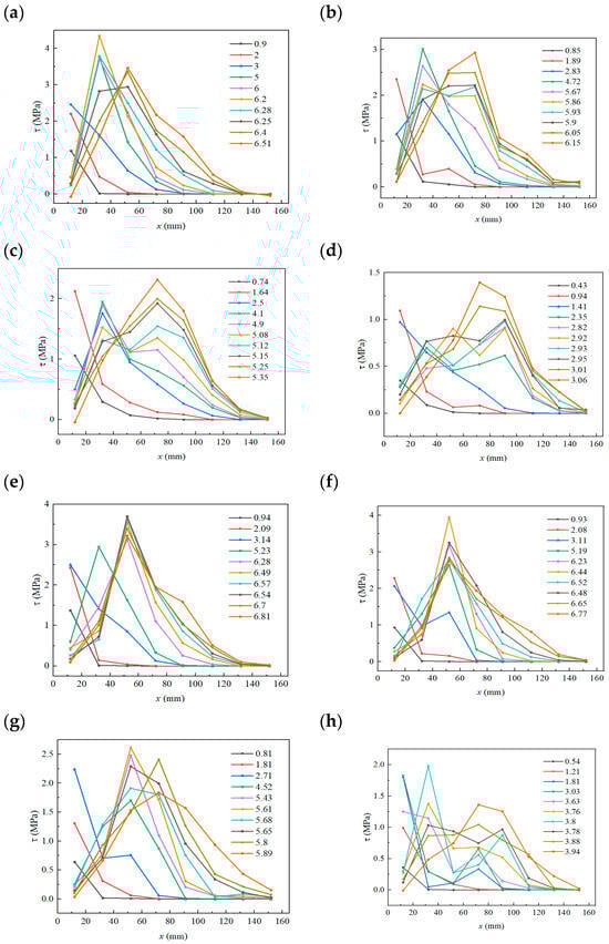 Accurate characterization of the CFRP–concrete bond–slip constitutive law is essential for reliable modeling of bonded components. Because bond–slip curves at different measurement points display similar trends [] while data at the free end are highly scattered, this study analyzes the midpoint between measurement points 1 and 2 at the loaded end.