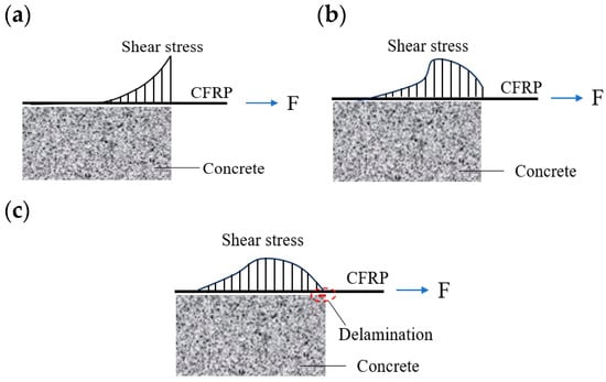 The CFRP–concrete interface should be considered a multilayer interaction region rather than a single, well-defined interface. It comprises the CFRP layer, the CFRP–adhesive interaction zone, the adhesive layer, the adhesive–substrate interaction zone, and the concrete substrate [] (Figure 8). Five principal failure modes were observed in the CFRP–concrete double shear specimens, which are CFRP rupture, CFRP–adhesive debonding, adhesive layer failure, adhesive–concrete delamination, and shear failure of the concrete substrate [].