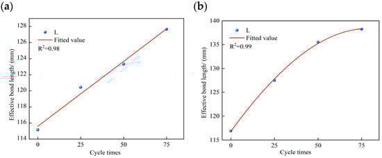 - Predictive models for effective bond length and for bond–slip behavior were calibrated to the experimental data for MPC and EP adhesives. The effective-bond-length model achieved R2 = 0.98 for the MPC group and R2 = 0.99 for the EP group. The bond–slip model produced R2 ranges of 0.93–0.96 (MPC) and 0.96–0.98 (EP), indicating close agreement with the experimental results.