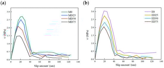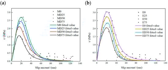 Figure 19 shows the bond–slip model curves fitted with Equation (5) for all specimen groups. Prior to sulfate freeze–thaw exposure, both adhesive groups exhibit similar curve shapes. As the cycle number increases, peak stress decreases, and the slip at peak shifts slightly toward smaller values, indicating reduced maximum shear stress, lower slip capacity, and diminished load-bearing ability. Curve fitting yields coefficients of determination R2 of 0.96, 0.95, 0.95, and 0.93 for M0, MD25, MD50, and MD75, respectively, and 0.96, 0.98, 0.98, and 0.98 for E0, ED25, ED50, and ED75, respectively, demonstrating good fit quality.