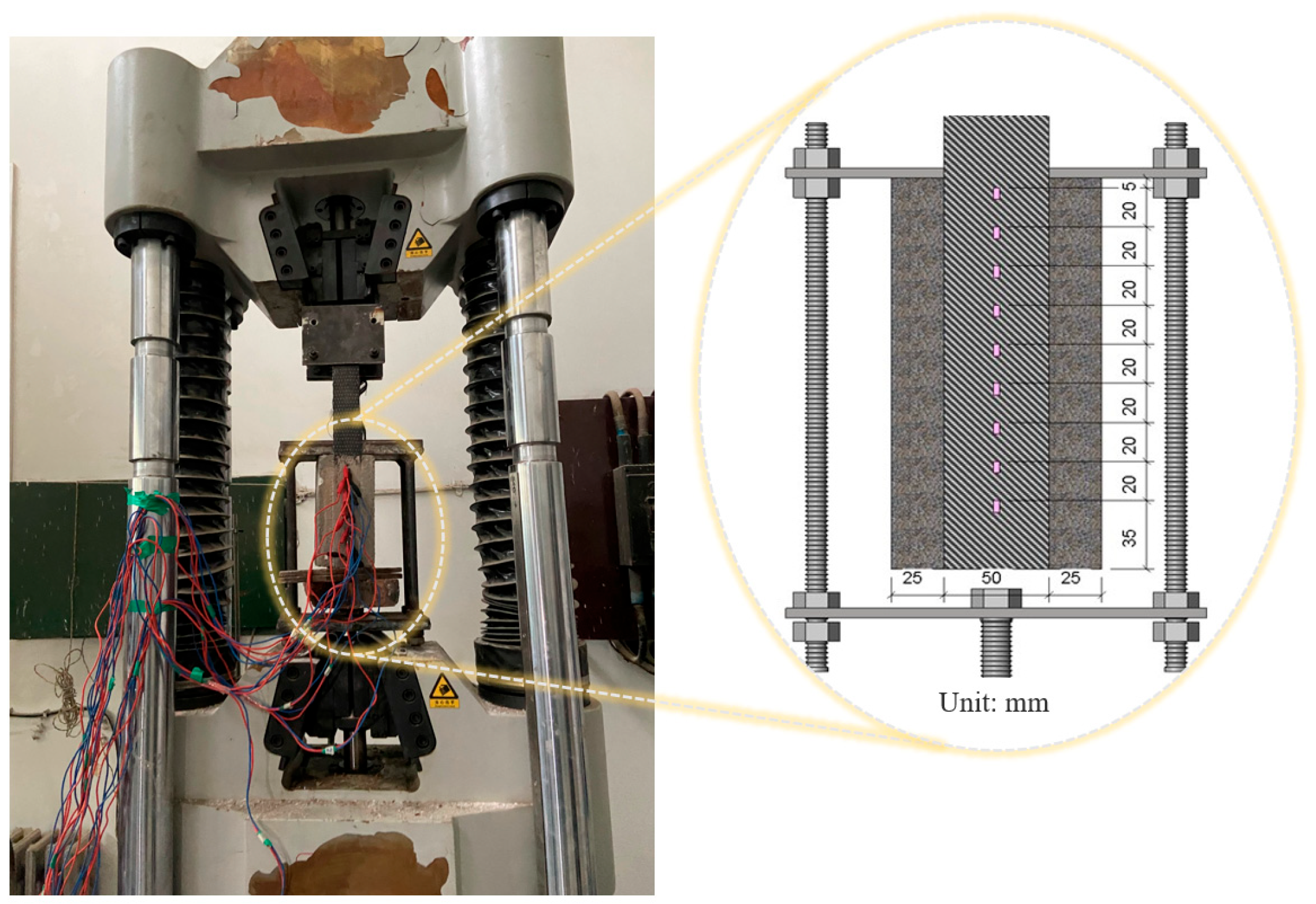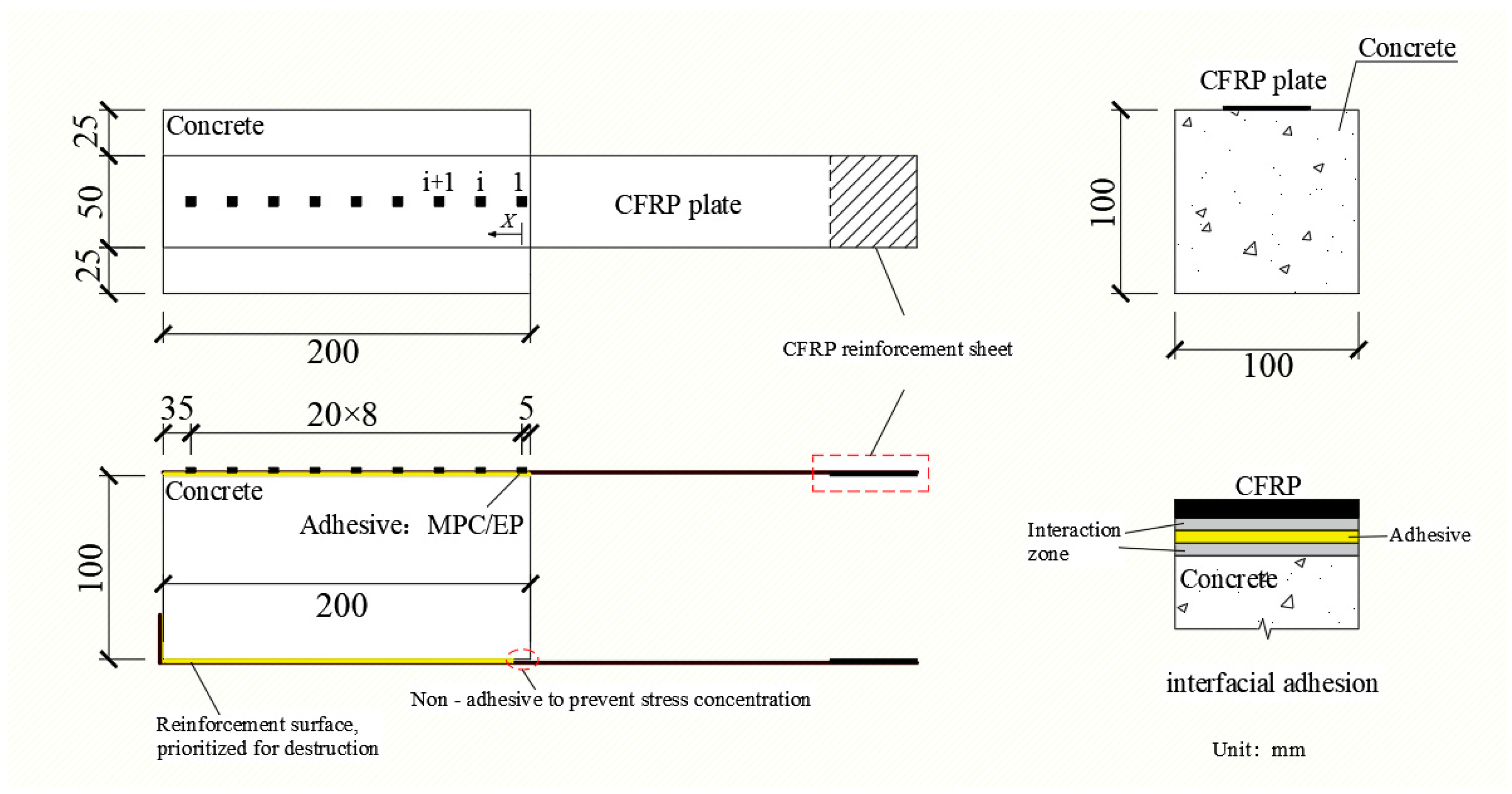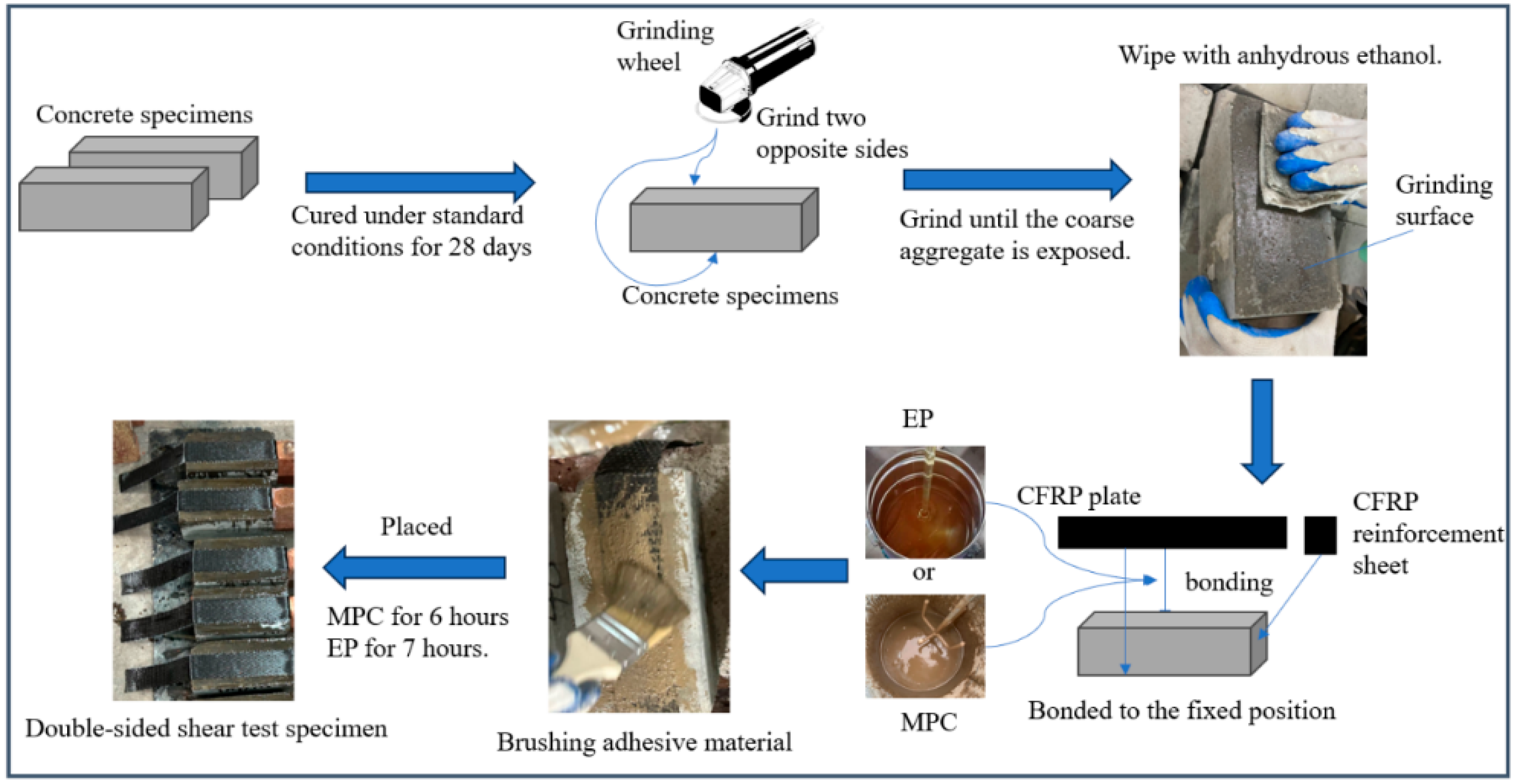 - Bond CFRP using either EP or MPC to evaluate adhesive effects on shear performance. The design bond length is 200 mm [44]. For EP bonding, mix components A and B in a 2:1 ratio, stir thoroughly, and apply to the bonding area. After approximately 7 h, reapply the epoxy, position the CFRP, roll to consolidate, reapply epoxy, and cure for 48 h. Repeat the same procedure on the opposite face. For MPC bonding, apply freshly mixed MPC to the bonding area, position the CFRP, roll to consolidate, apply an additional MPC layer over the CFRP, allow 6 h set time, and then repeat on the other face. The selection of 48 h curing for EP and 6 h hardening for MPC in this study is based on their markedly different curing behaviors. EP undergoes a relatively slow polymerization reaction, and a 48 h cure ensures attainment of a stable strength plateau. By contrast, MPC hardens via a rapid acid–base reaction and develops load-bearing early strength within 6 h, reflecting its advantage of fast setting and early strength gain. Spacers were placed on both sides of the concrete bonding area to control bond-layer thickness. After adhesive application, the layer was leveled with a trowel and the CFRP was rolled to ensure full contact. Spacers were removed to produce a uniform bond layer, and thickness was measured at the specimen side with a vernier caliper. The mean controlled thickness was 1.5 ± 0.5 mm for EP and 2.5 ± 0.5 mm for MPC. The thicker MPC layer, due to incorporated aggregate, was trimmed by sanding [45,46].