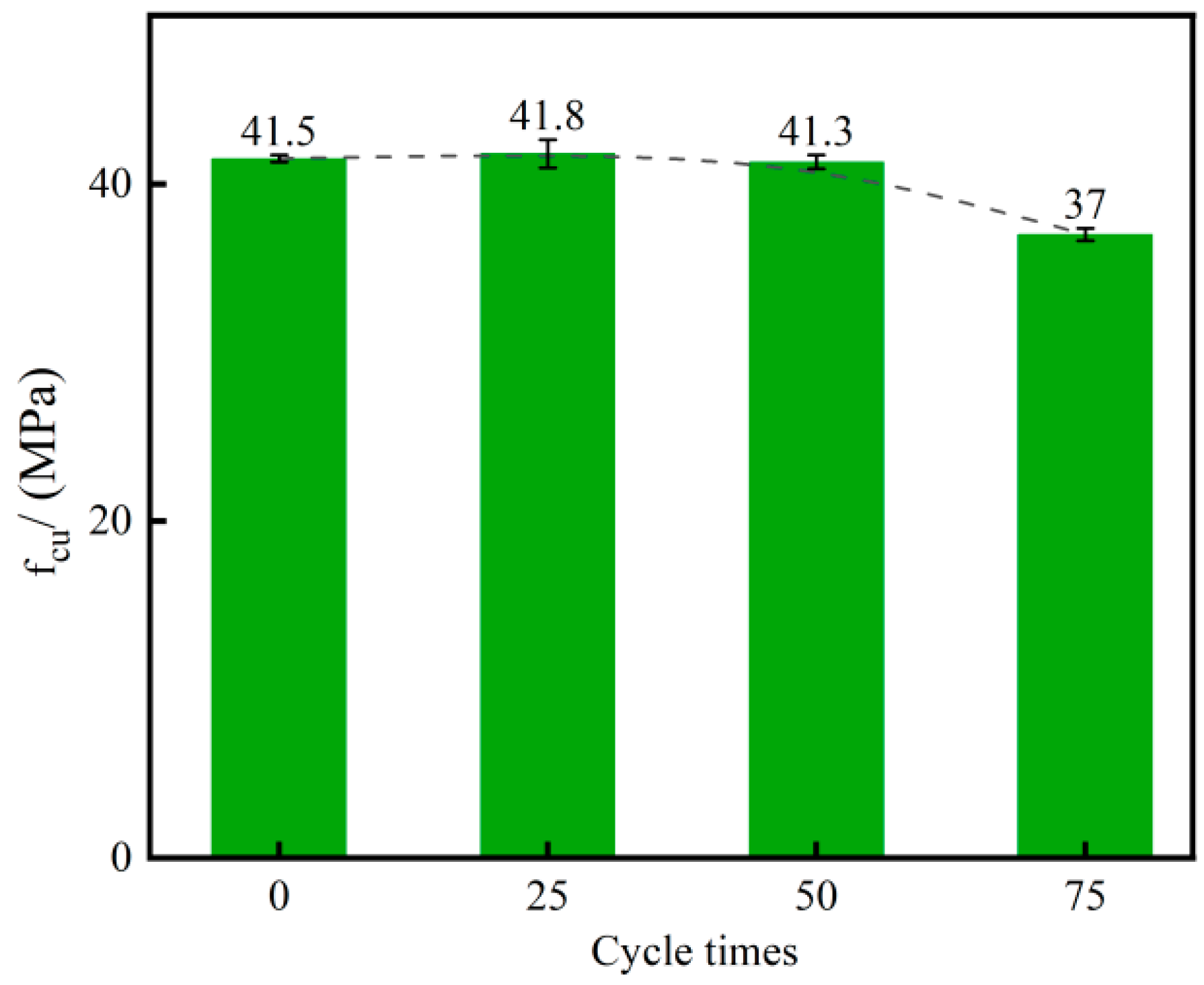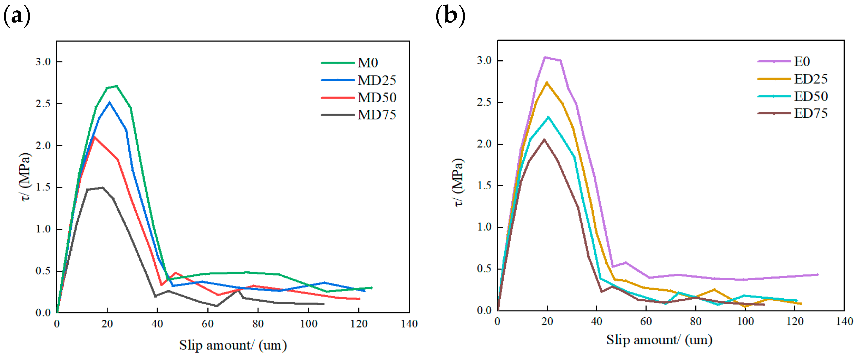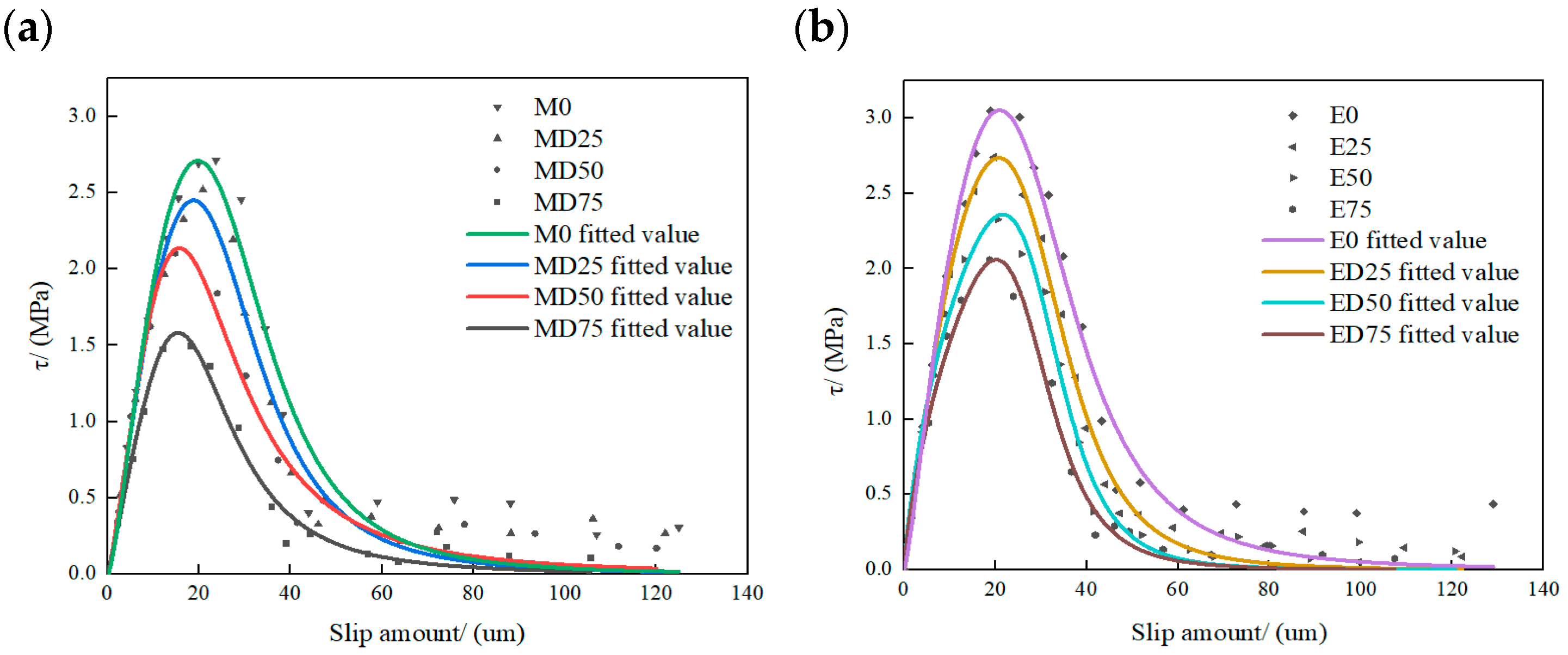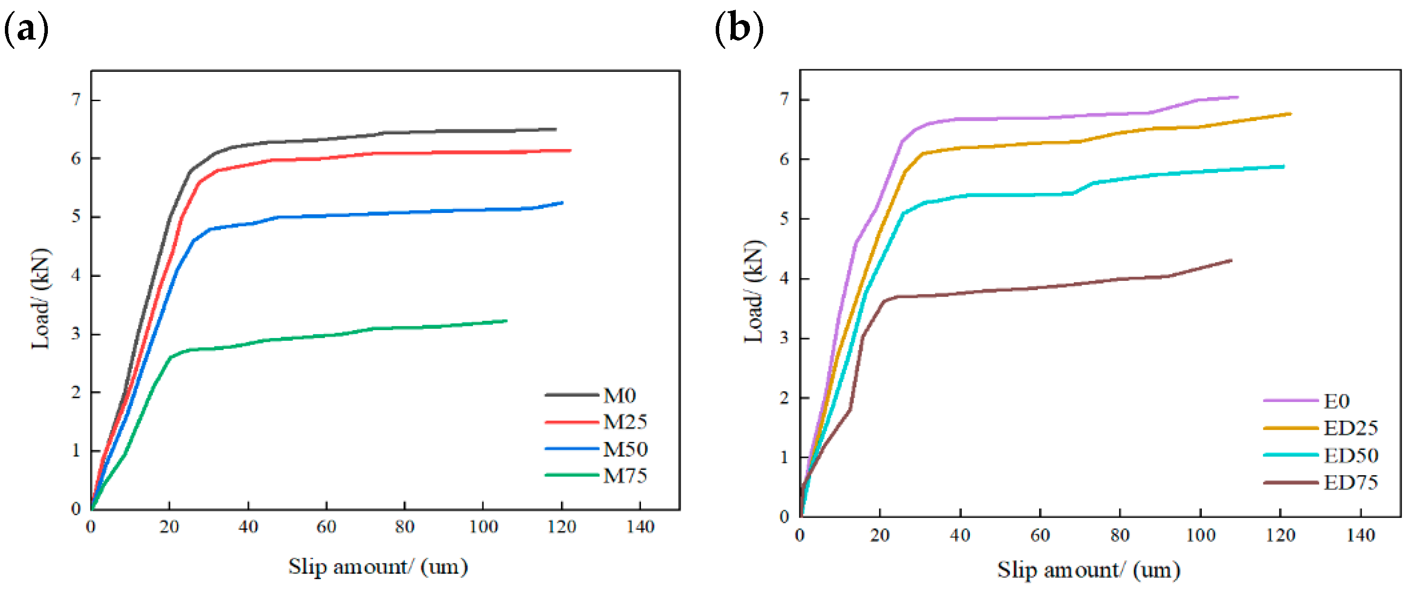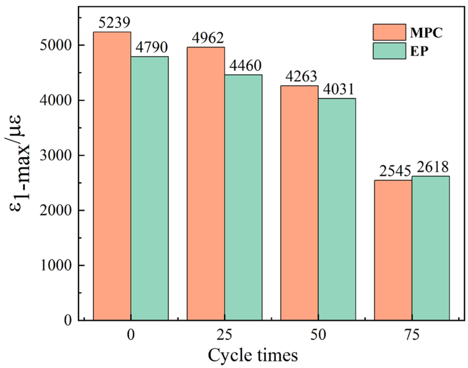 - The MPC group showed higher peak strains than the EP group by 9.28%, 10.13%, 5.99%, and 0.86% at 0, 25, 50, and 75 cycles, respectively, indicating greater ductility. Accordingly, MPC specimens can absorb more deformation energy before failure, thereby delaying damage propagation.