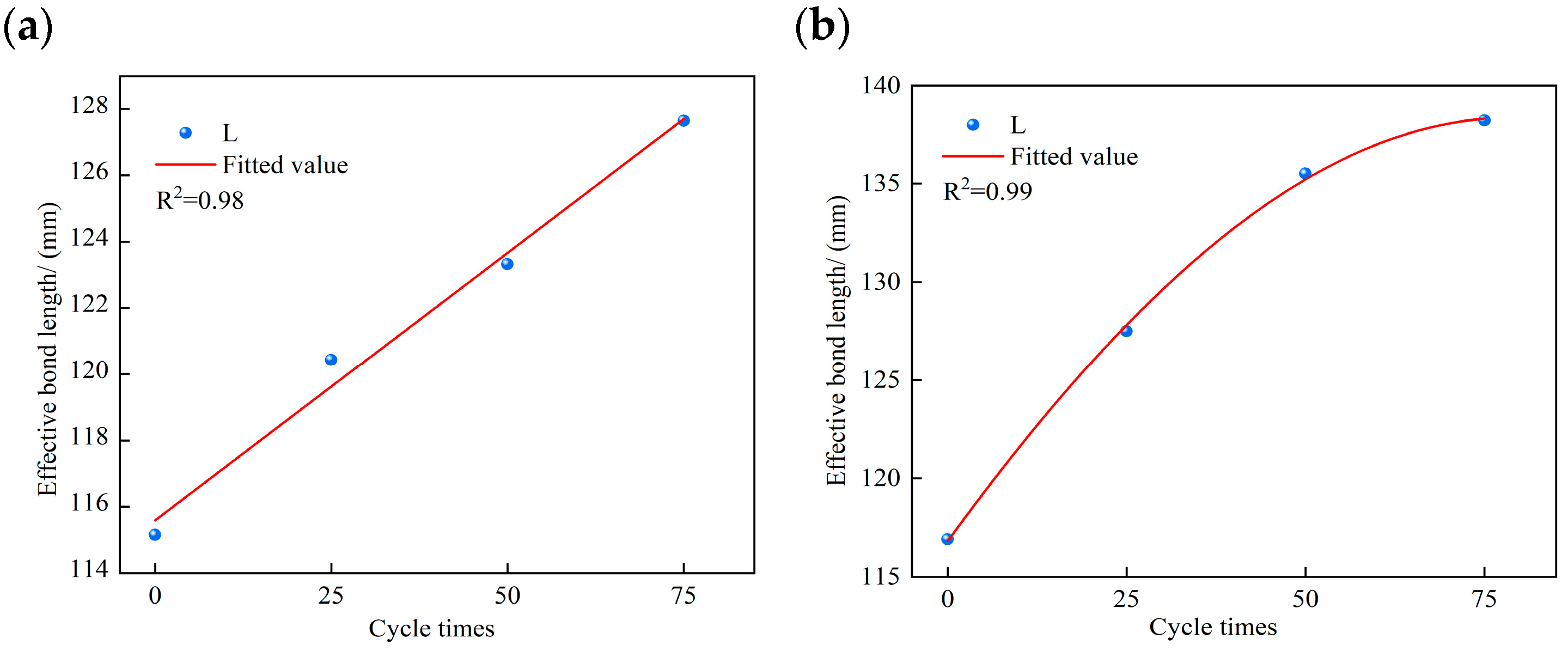 - Predictive models for effective bond length and for bond–slip behavior were calibrated to the experimental data for MPC and EP adhesives. The effective-bond-length model achieved R2 = 0.98 for the MPC group and R2 = 0.99 for the EP group. The bond–slip model produced R2 ranges of 0.93–0.96 (MPC) and 0.96–0.98 (EP), indicating close agreement with the experimental results.