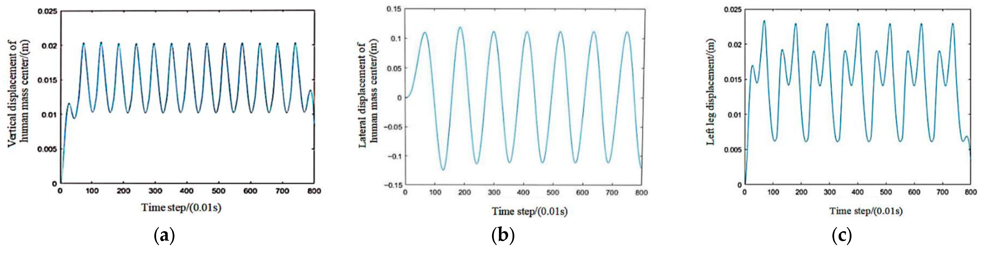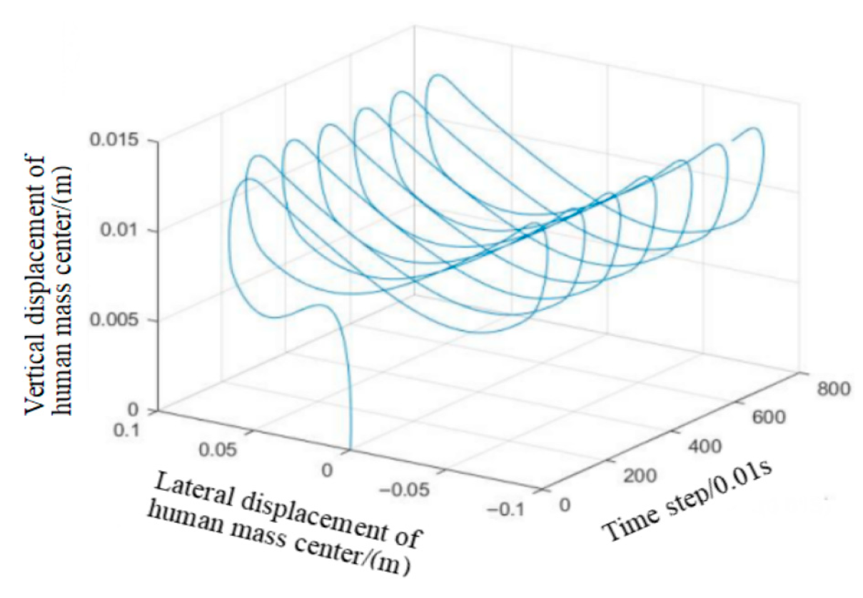 (1) Through comparison and validation with existing research results and empirical data, the accuracy of the single-person bidirectional multi-degree-of-freedom biomechanical model established in this study and the pedestrian movement path derived using the cellular automaton principle, which considers static fields, dynamic fields, and repulsion fields to simulate interactions between pedestrians, is confirmed.