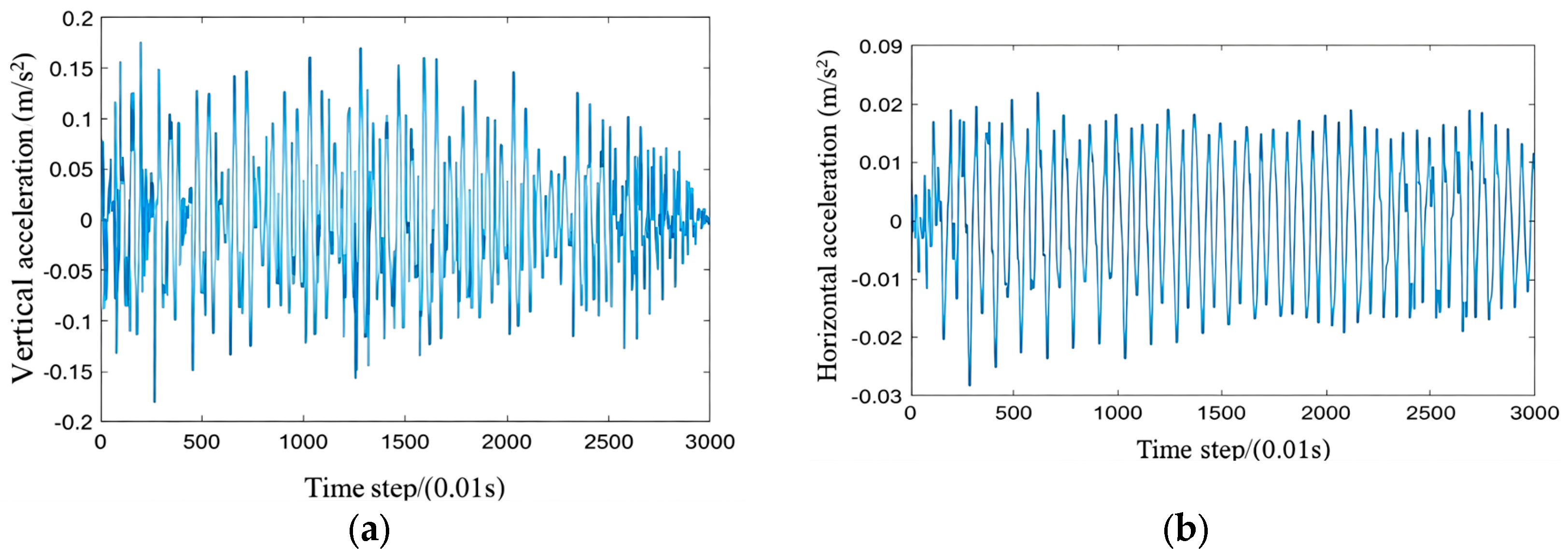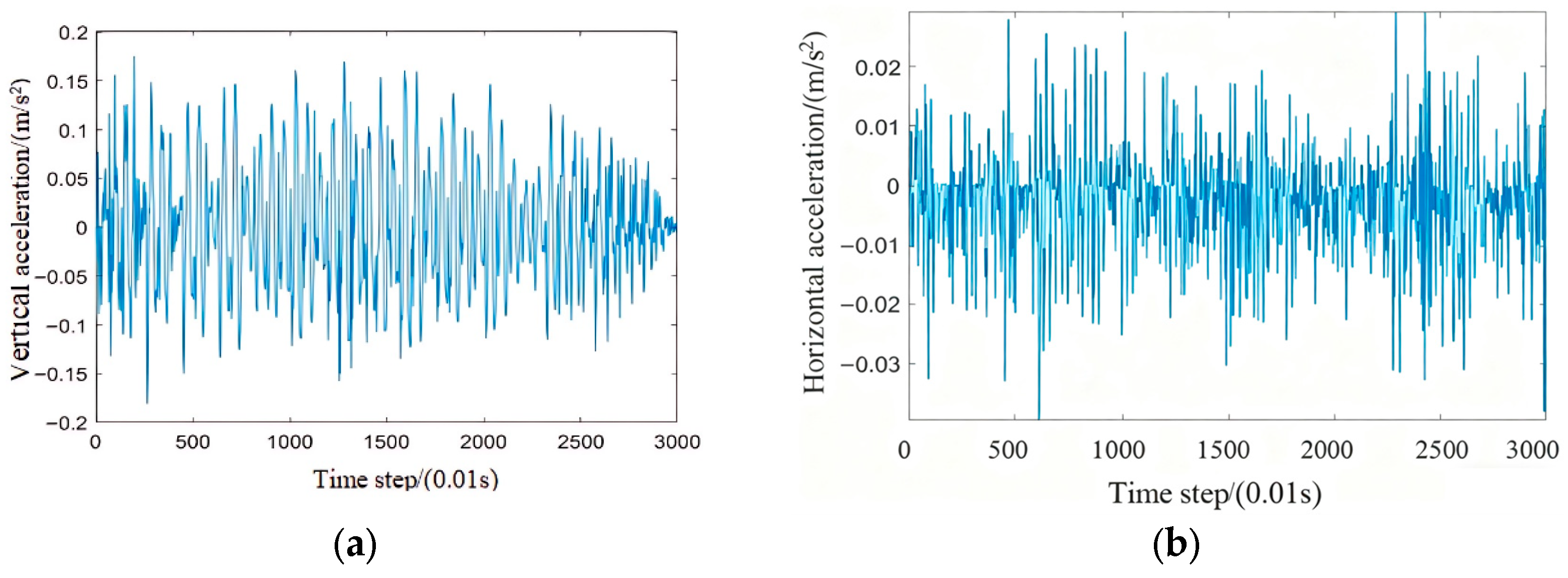 As the number of pedestrians on the bridge increases, the changes in horizontal acceleration of the bridge are not as pronounced as those in vertical acceleration. This is because, even though the number of pedestrians increases on the bridge, they do not walk in perfect synchronization. The random nature of pedestrians’ steps tends to counteract the lateral vibrations of the bridge. Pedestrian walking has different characteristics; this work will be studied later.
