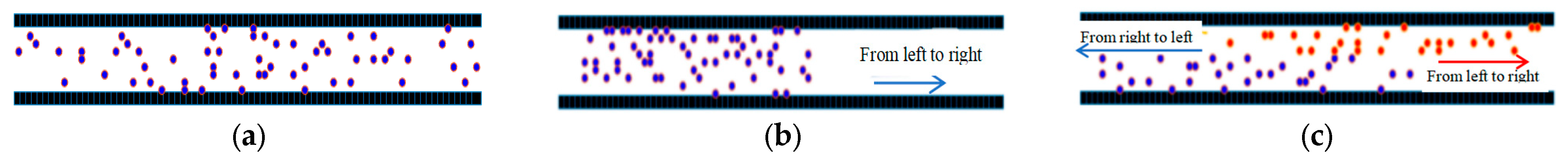 Figure 18 displays the trajectories of pedestrians under free evacuation, unidirectional movement, and bidirectional movement for an initial number of