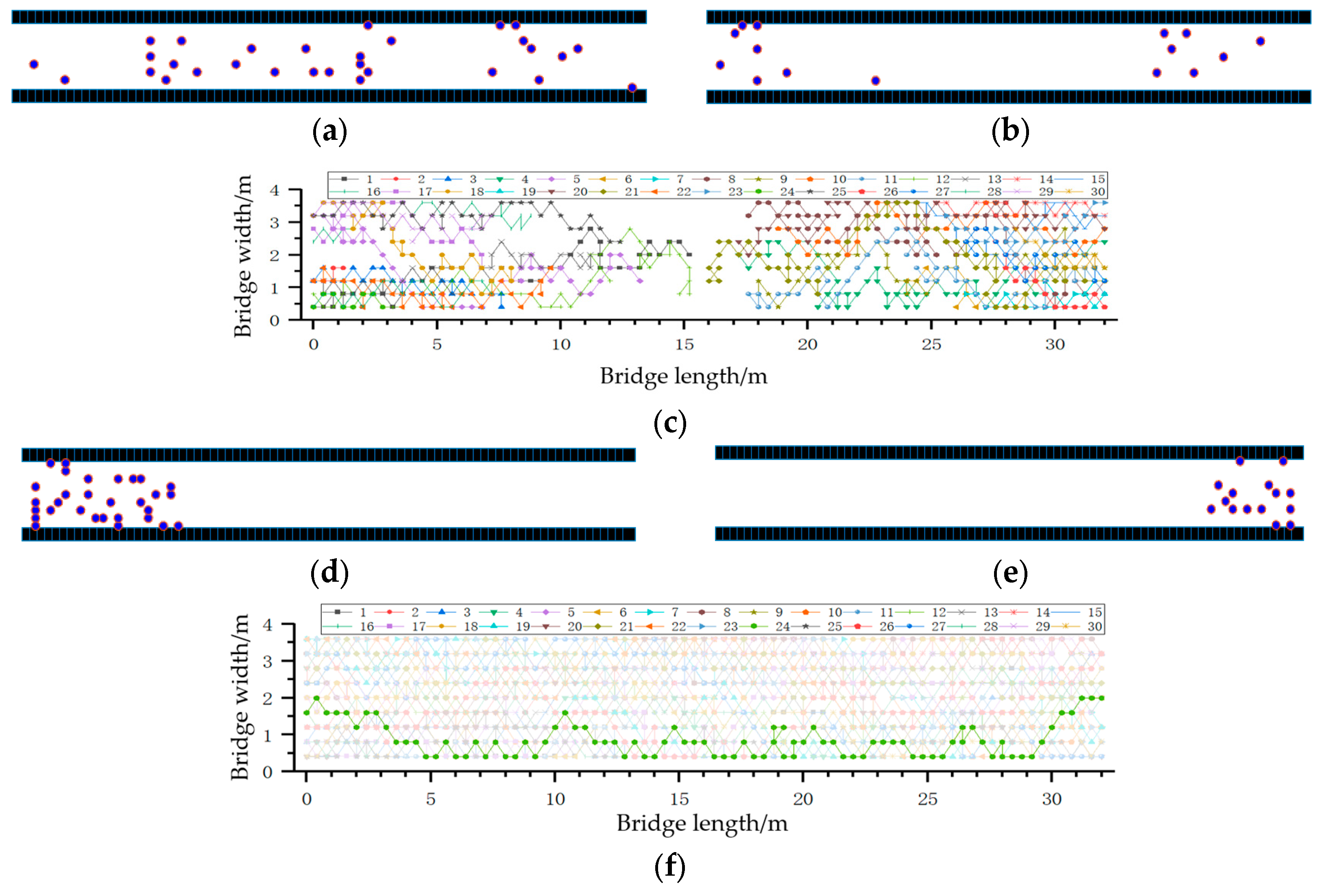 Utilizing the pedestrian flow model, the spatial coordinates of pedestrians on the overpass are recorded for each time step. Connecting these coordinates provides the trajectory of pedestrian movement.