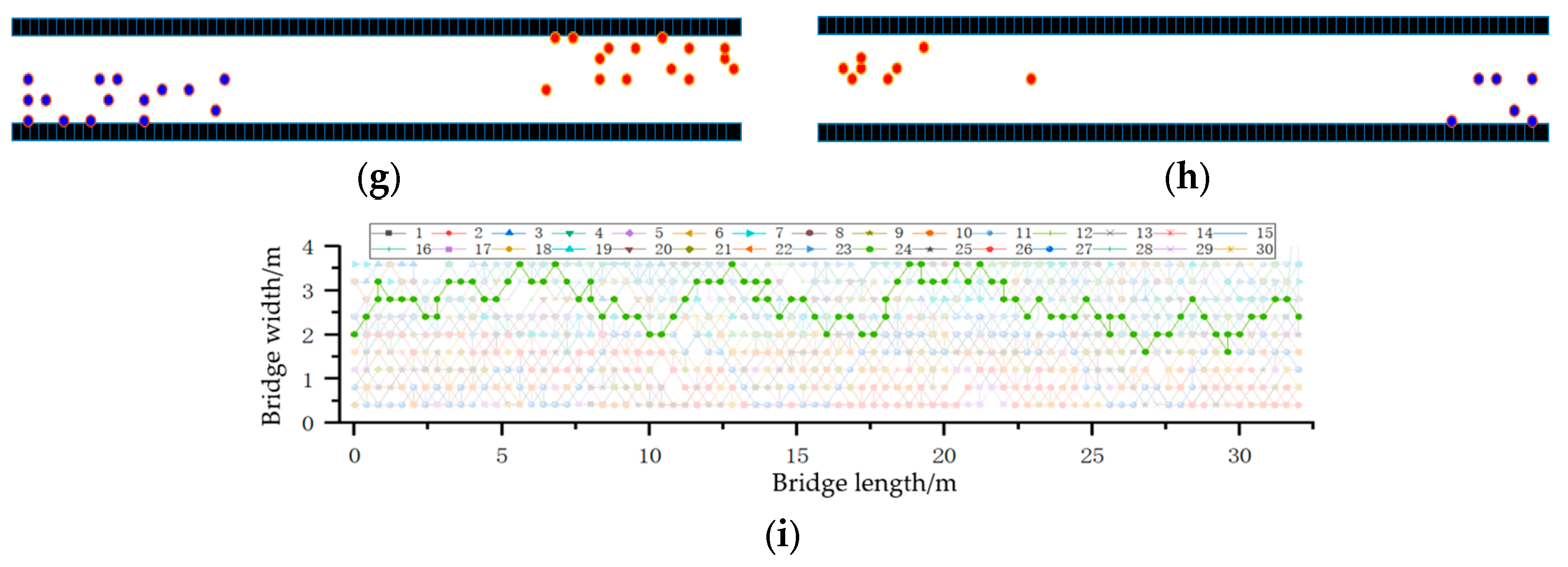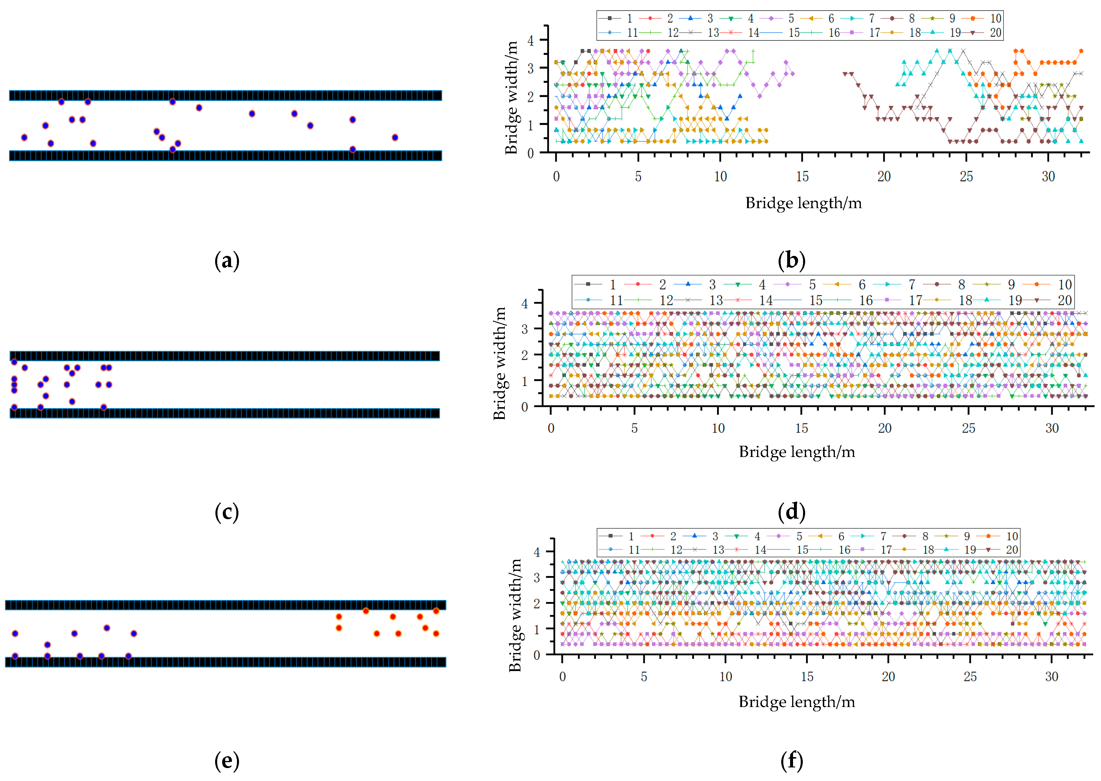(3) During pedestrian movement, significant clustering of two or more people can occur. Different pedestrian paths also affect the loading on the bridge structure. After incorporating a repulsion field into the cellular automaton model for optimization, this clustering phenomenon is notably improved, making it more consistent with real-world scenarios.