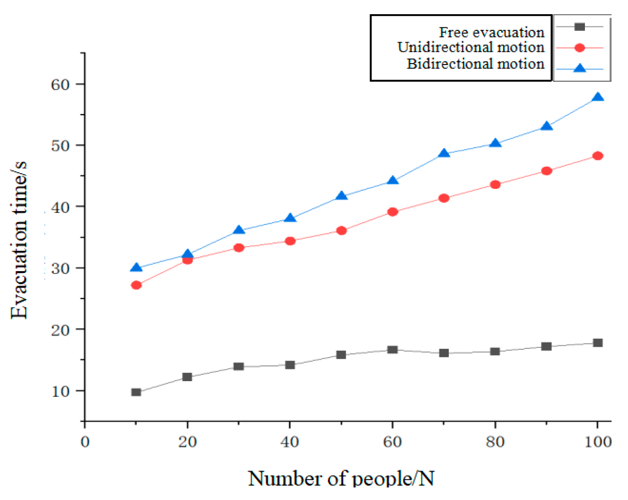 Figure 15, it can be observed that there is a close relationship between the initial number of pedestrians and the evacuation time. Especially in unidirectional or bidirectional movement scenarios, as the number of people on the bridge increases, the evacuation time also significantly increases. For instance, as the number of pedestrians increases from 10 to 40, the evacuation time under these conditions rises from 9.72 to 14.16 s, indicating a substantial change in pedestrian movement time. However, as the initial number of people continues to increase, the rate at which the movement time grows noticeably slows down.