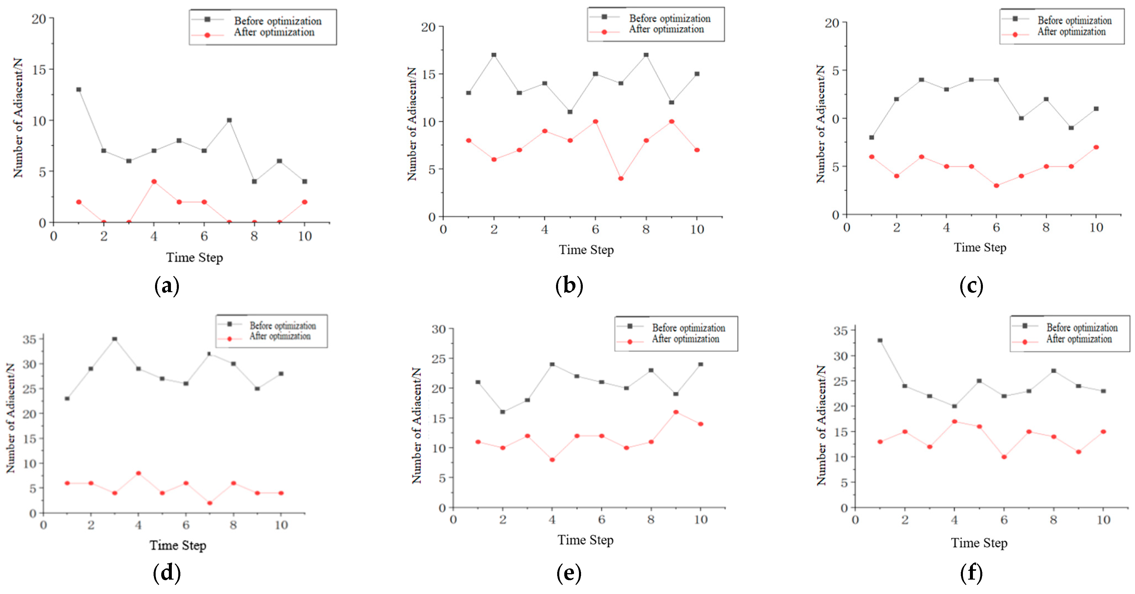N = 60, under three operational conditions, evacuation state, unidirectional movement state, and bidirectional movement state, the number of clustered pedestrians in the model was statistically analyzed before and after optimization for a certain time frame. The fixed parameters are as follows: static field parameter