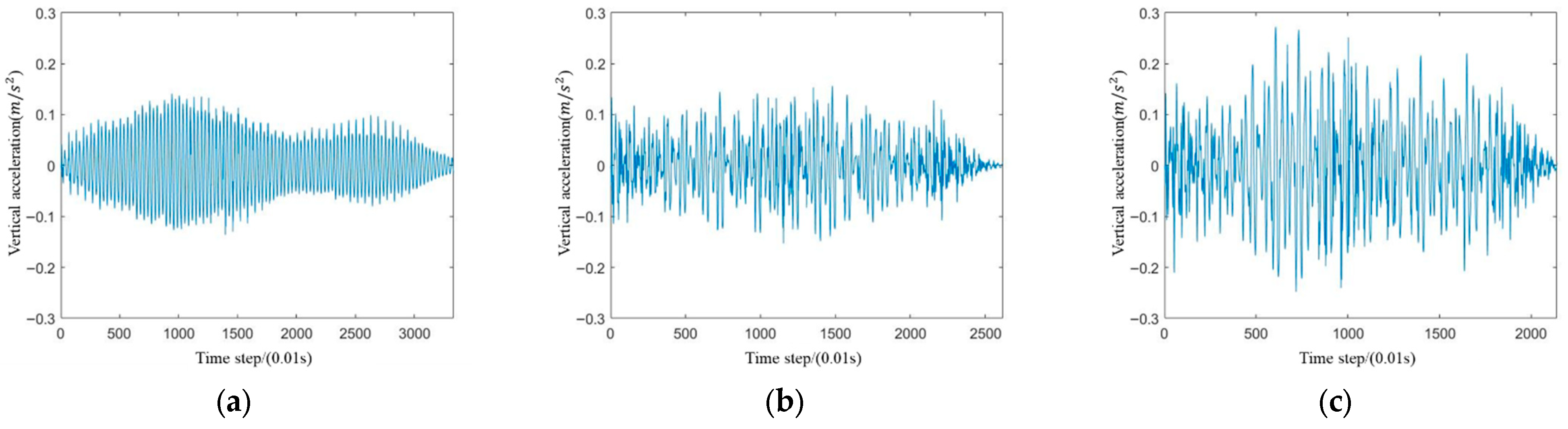 Figure 23 presents the vertical acceleration time history curves at Measurement Point 1 for the four different pedestrian densities.