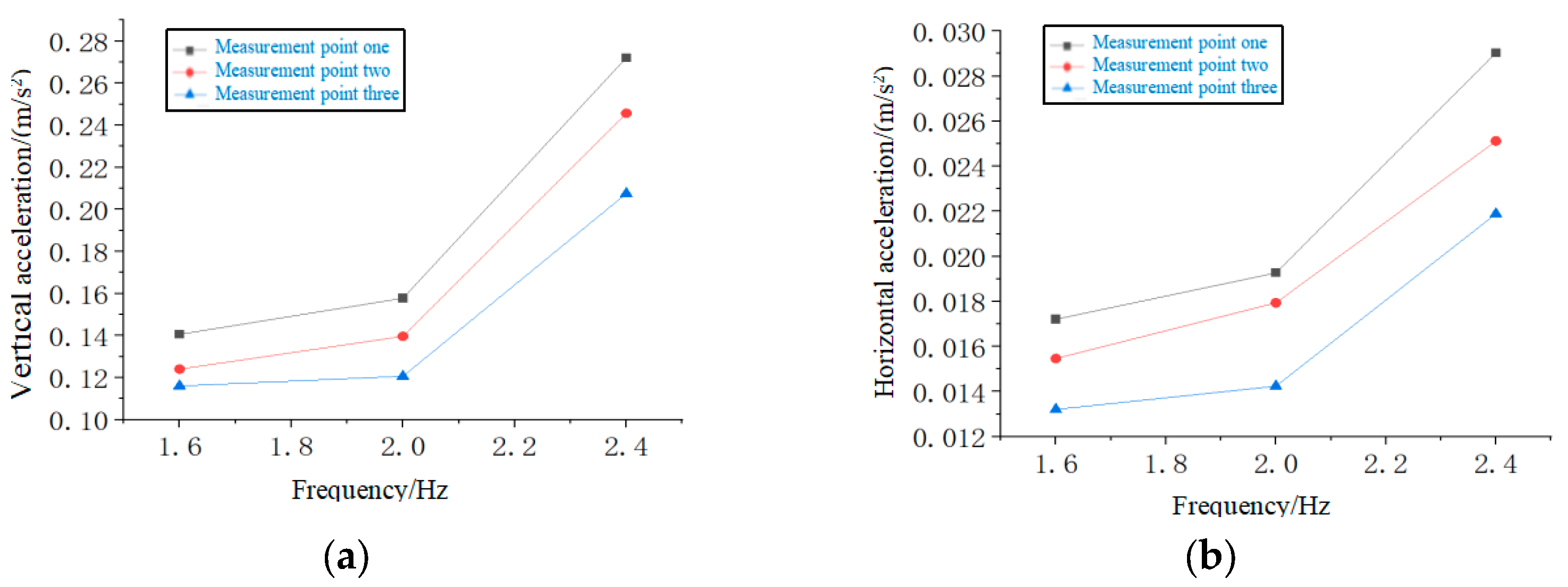 Table 6 shows that at all measurement points, the maximum vertical acceleration significantly increases when the accompanying frequency increases from 1.6 Hz to 2.4 Hz. At the mid-span position, the acceleration jumped from 0.141 m/s